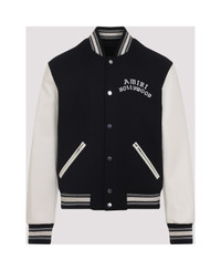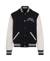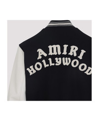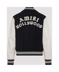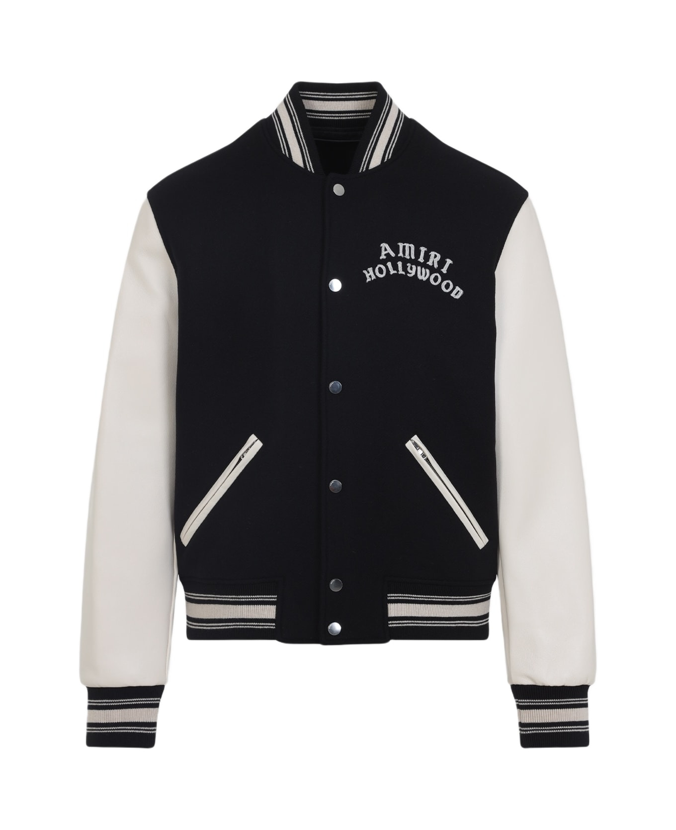Amiri Hollywood Black Wool Bomber Jacket. Crafted from black wool, white leather long sleeves, round neckline, snap button fastening on the front, embroidered logos on the breast and on the back, front zip pockets, ribbed edges, straight hem. Made in: Italy Color: Black Model number: AMOUBB1066BLACK