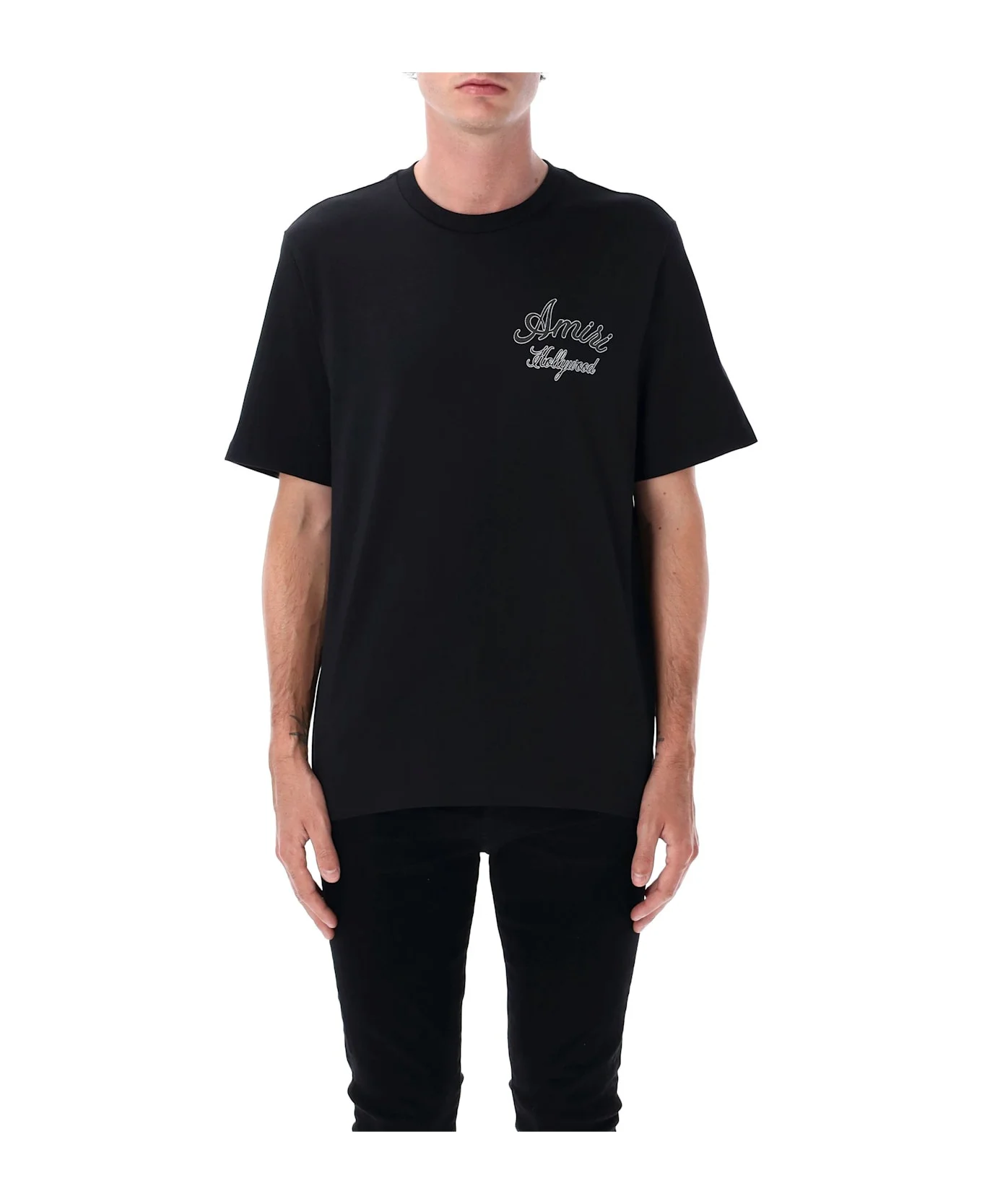 Cotton Hollywood Tee By Amiri. Featuring: Ribbed Crew Neck Short Sleeves Hollywood Motif At Front And Back Model Is 1,90 M And Wears Size L Composition: 100% cotton Made in: Italy Color: BLACK Model number: AMJYTE1265BLACK