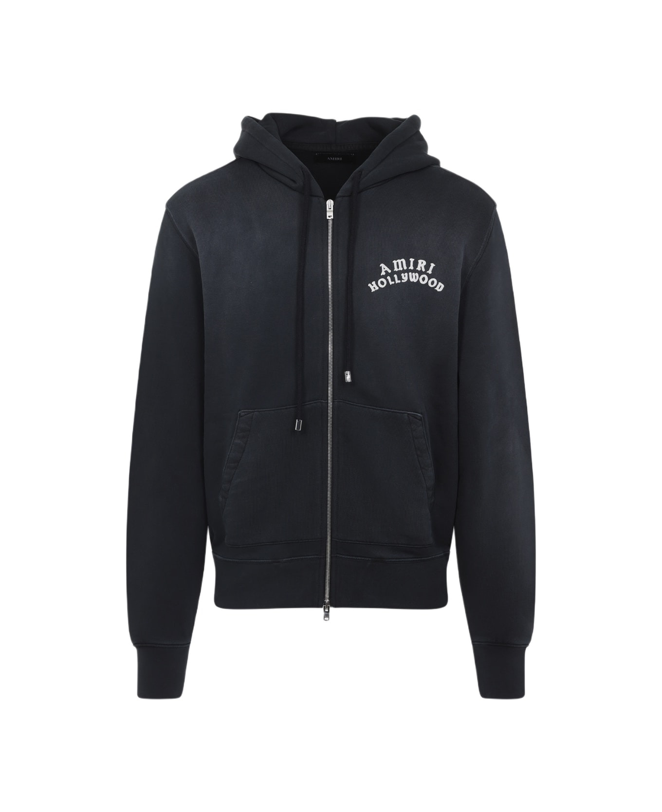 Amiri Black Cotton Hollywood Zip Hoodie. Pure black cotton hoodie, tonal hood, front tonal drawstring detail, chest contrasting white logo, side pockets, back contrasting white logo, long sleeves, elasticated cuffs and hem, straight hem. Made in: Italy Color: Black Model number: AMJYHD1132BLACK