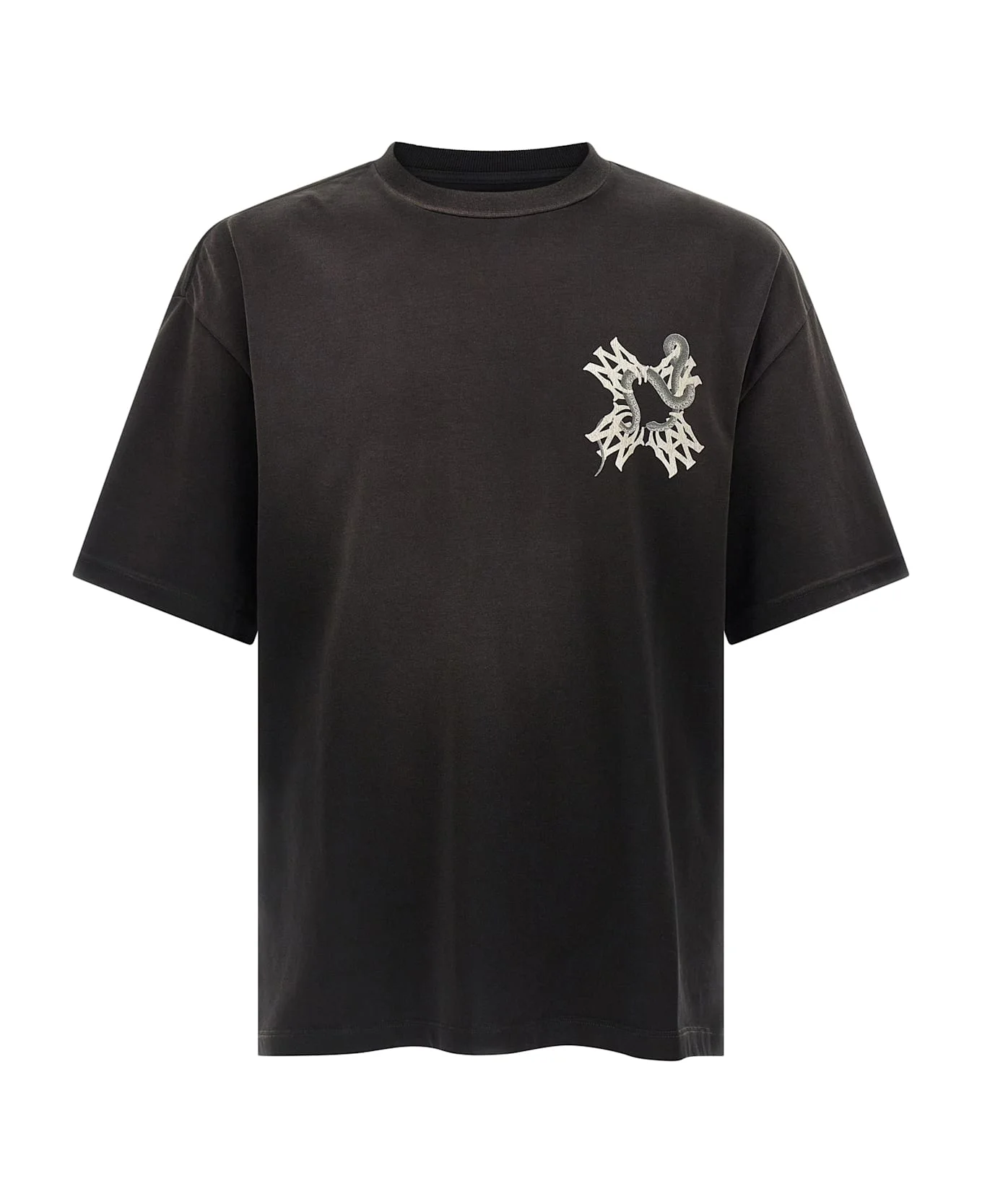 'MA Quad Snake' sun-faded cotton T-shirt with front and back print, crew neck, short sleeves with dropped shoulders. This garment has undergone a special process that has resulted in intentional variations in shades and colors and adds unique characteristics to the garment. Composition: 100% cotton Made in: Italy Color: Black Size and fit: - oversized fit Model number: AMTOJR1130001
