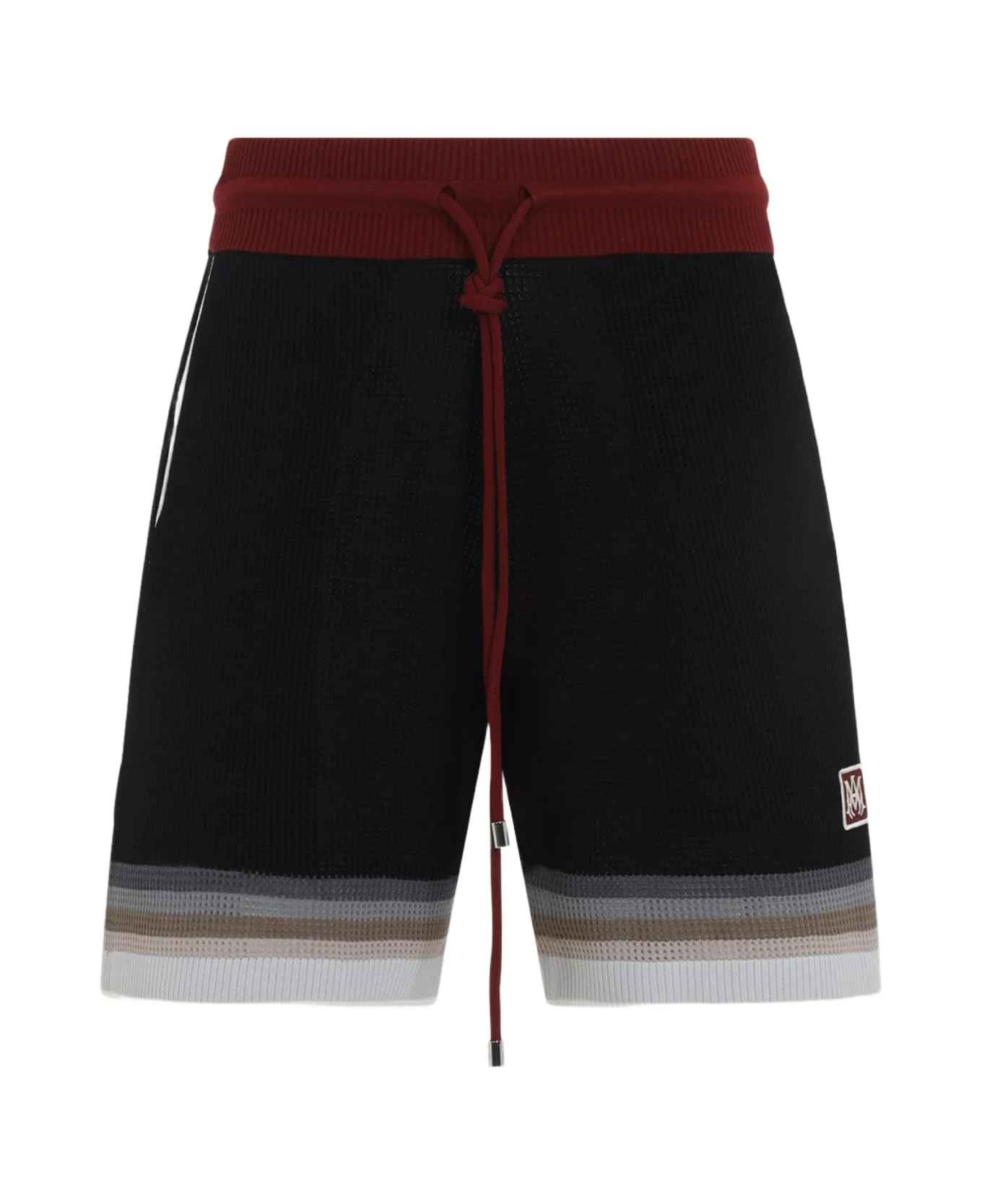 Amiri Black Ma Sport Shorts. Crafted in viscose and polyester blend. Red elastic waist, front red drawstring details, side pockets, side patch logo, straight hem. Brown, beige and grey stripe details on the hem. Perforated details all-over, fully lining. Made in: Italy Color: Black Model number: AMBMSO1065001
