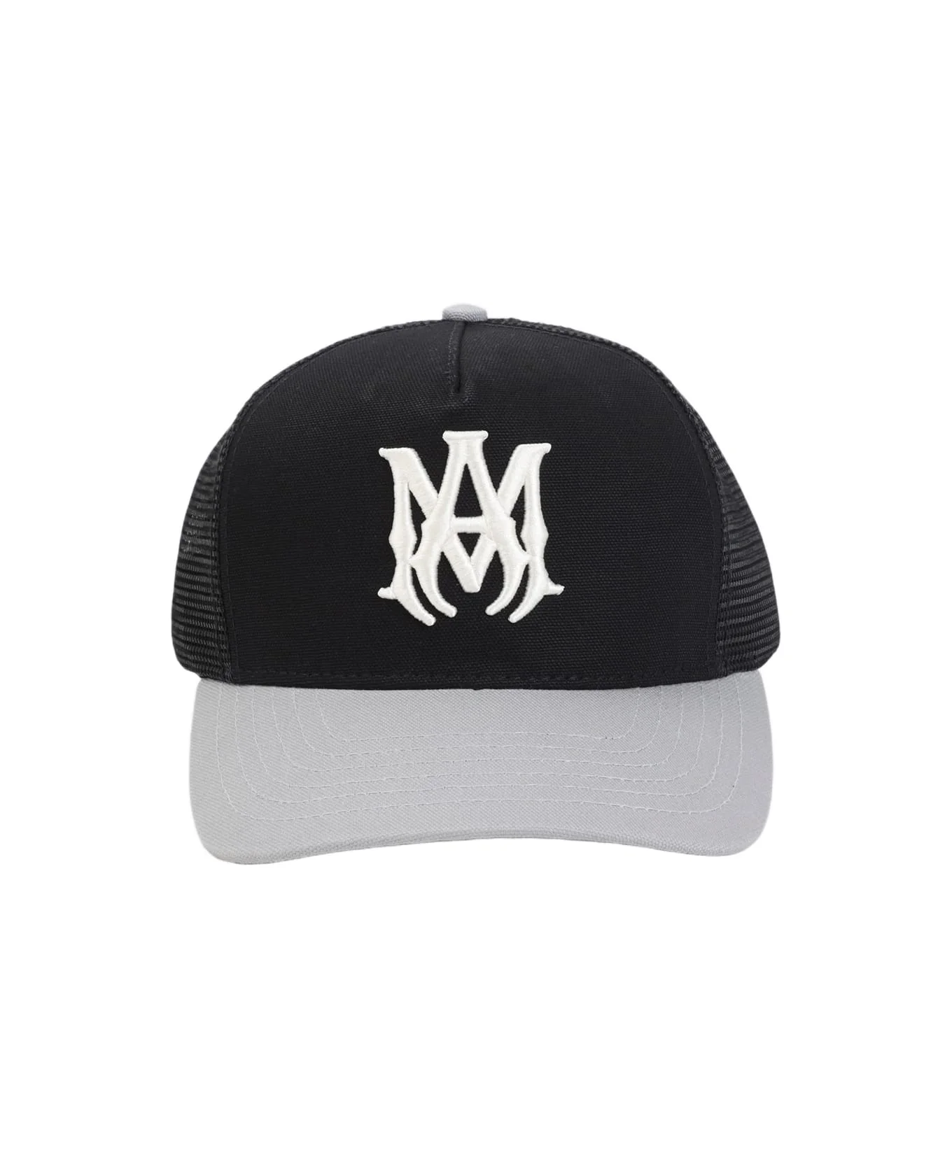 Amiri Black Cotton Ma Trucker Hat. Pure black cotton cap, six panel construction, front contrasting white embossed logo, grey visor, back tonal mesh fabric, back adjustable strap. Made in: United States of America Color: Black Model number: AMSAHE1018BLACK