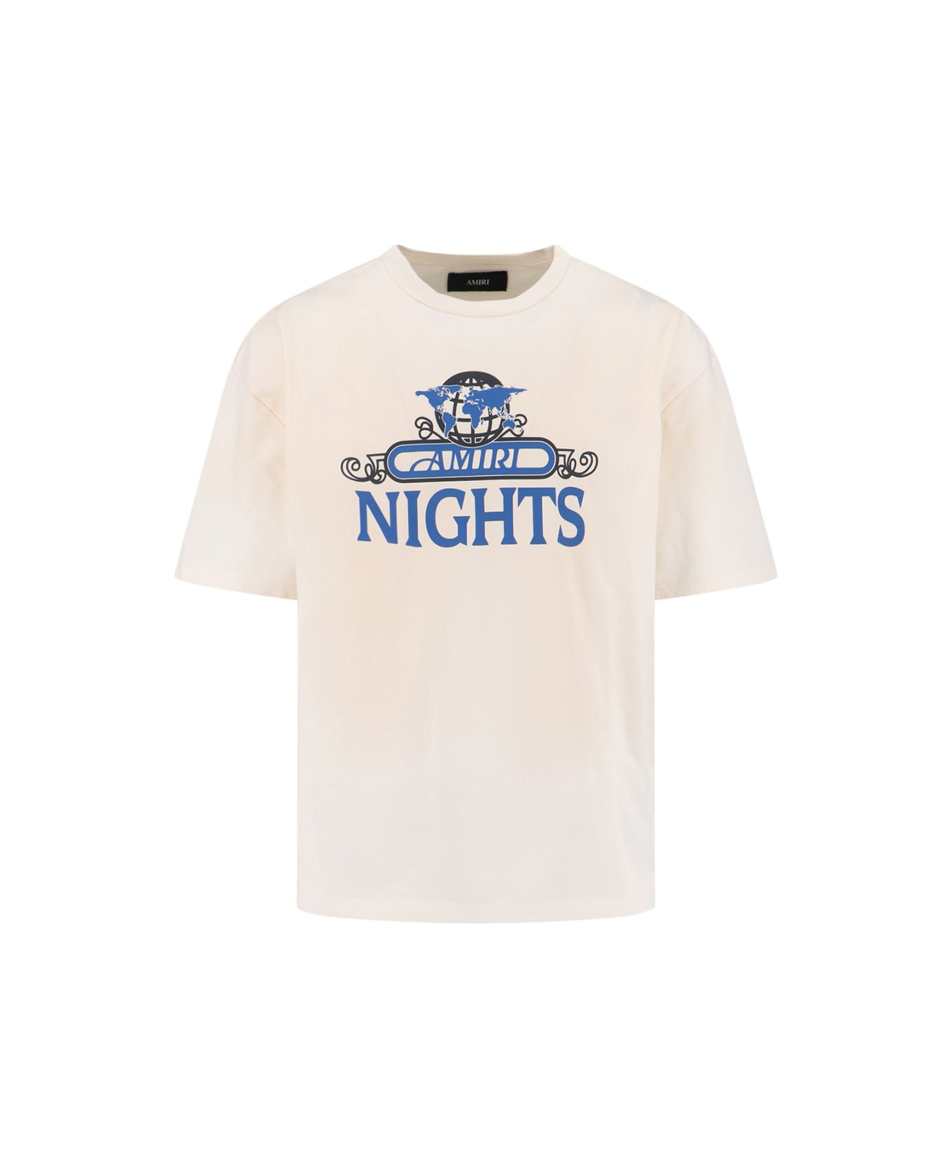 Amiri 'NIGHTS' logo T-shirt in cream cotton with distressed wash, crew neck, ribbed trims, dropped shoulders, short sleeves, contrast maxi logo print on the front and back, straight hem. Composition: 100% Cotton Made in: Italy Color: Cream Size and fit: - Vestibilita oversized Model number: AMJYTE1207IVORY
