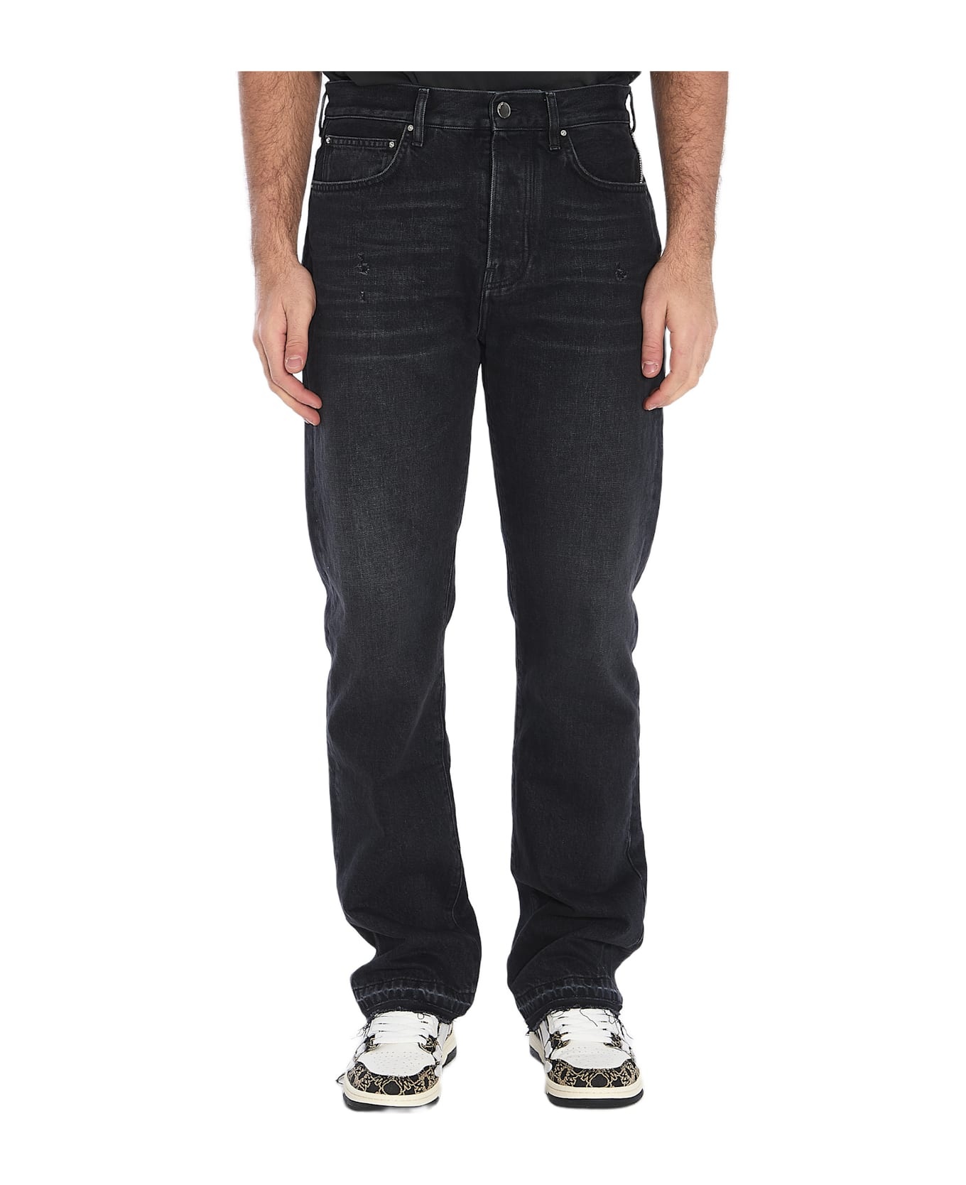 Straight jeans in black vintage-effect cotton denim. They feature a button closure, five pockets, belt loops, frayed hem, a black patch with the Amiri logo, and a silver-tone metal logo tag on the back. The model is 189cm tall and wears a size US 34. Size nationality: US Composition: Ext: 100% Cotton; Int: 65% Polyester, 35% Cotton Made in: Italy Color: BLACK Model number: AMDNGH1031VINTAGEBLACK