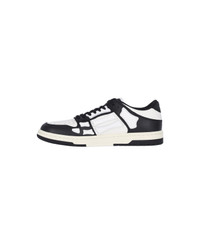 Amiri 'Skel' top-low sneakers in black leather with contrast leather details, round toe, lace-up closure, tonal metal logo detail, contrast logo patch on tongue, side leather inserts, contrast logo print on the tab, cream rubber sole, embossed logo detail on the side. Composition: 100% Calf Leather Made in: China Color: Black Model number: AMFOSR1098BLACKWHITE
