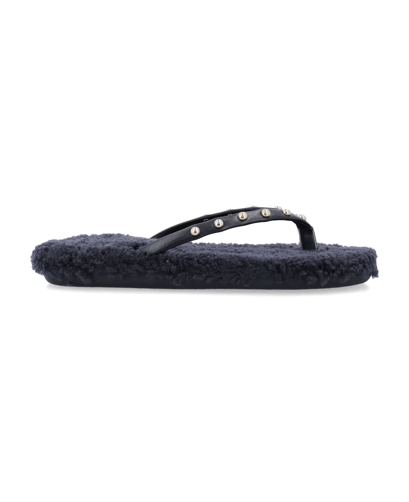 Saionara Thong Sandals By Ancient Greek. Featuring: Leather Strap With Stud Details Sheepskin-lined Cushioned Insole Flat Rubber Sole Composition: Upper, 90% cow leather, 10% brass Lining, 100% sheepskin Sole, 50% rubber Color: BLACK + BLACK Model number: SAIONARA39