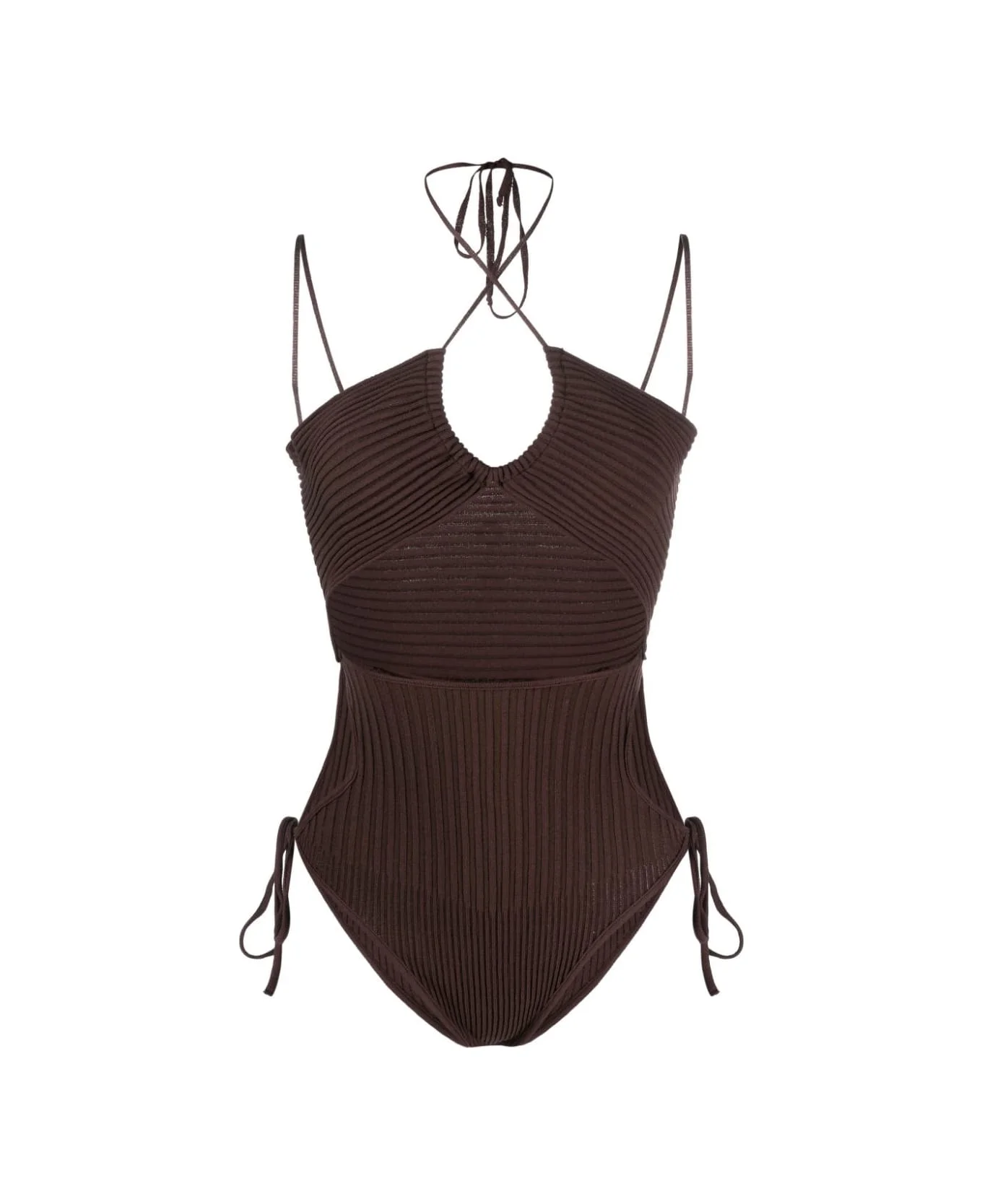 halterneck-fastening ribbed-knit bodysuit from ANDREADAMO featuring chocolate brown, ribbed knit, halterneck tie fastening, spaghetti straps, square open back and side tie fastening. Composition: Viscose, 80% , Polyester, 10% , Polyamide, 9% , Spandex/elastane, 1% Made in: Italy Color: Beige Size and fit: - This piece fits true to size. We recommend you get your regular size - Model is 1,75m / 5ft 8in wearing size S Model number: BO059474730477
