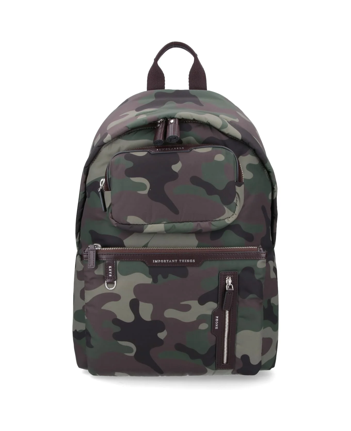 Anya Hindmarch 'Camouflage Multi Pocket' backpack in multicolor fabric with top handle, adjustable shoulder straps at the back, double zip closure, three front zip pockets, leather zipper detail, silver logo print at the front, leather logo patch at the back, inner flat pocket, main inner compartment. Composition: 70% Polyester, 30% Recycled Polyester Made in: China Color: Green Size and fit: - A 40 X L 29 X P 16 cm Model number: 201537CAMOUFLAGE