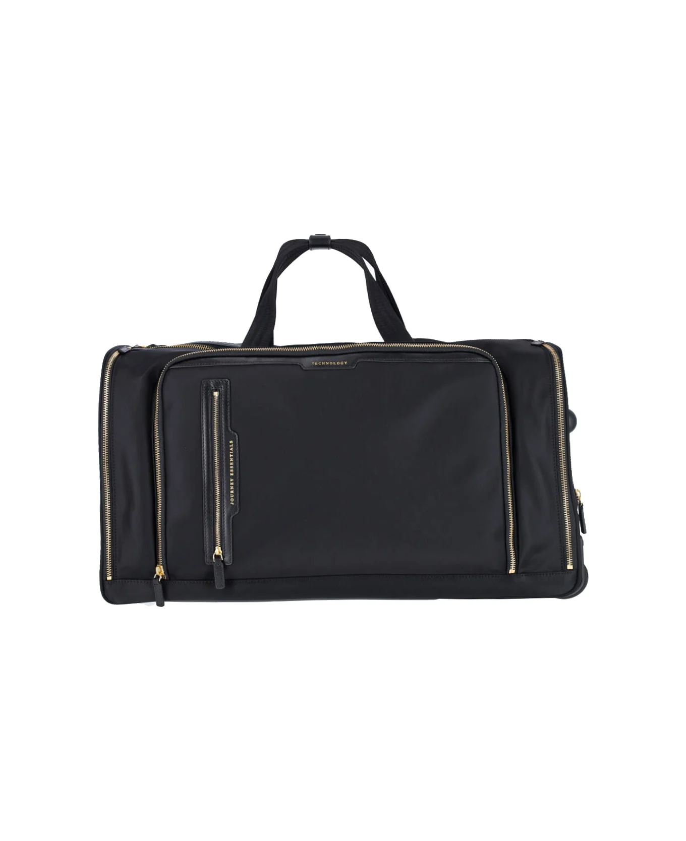 Anya Hindmarch '72 Hours Weekend' travel bag in black nylon with leather trims, top trolley handle, two handles, zip closure, one zip compartment on the front, detail of a maxi applied zip pocket, one side zip pocket, one maxi back zip pocket, gold metal logo detail, various inner zip pockets, main inner compartment, wheels on the bottom. Composition: 100% Recycled Nylon Made in: China Color: Black Size and fit: - A 30 x L 54 x P 24 cm Model number: 193498BLACK
