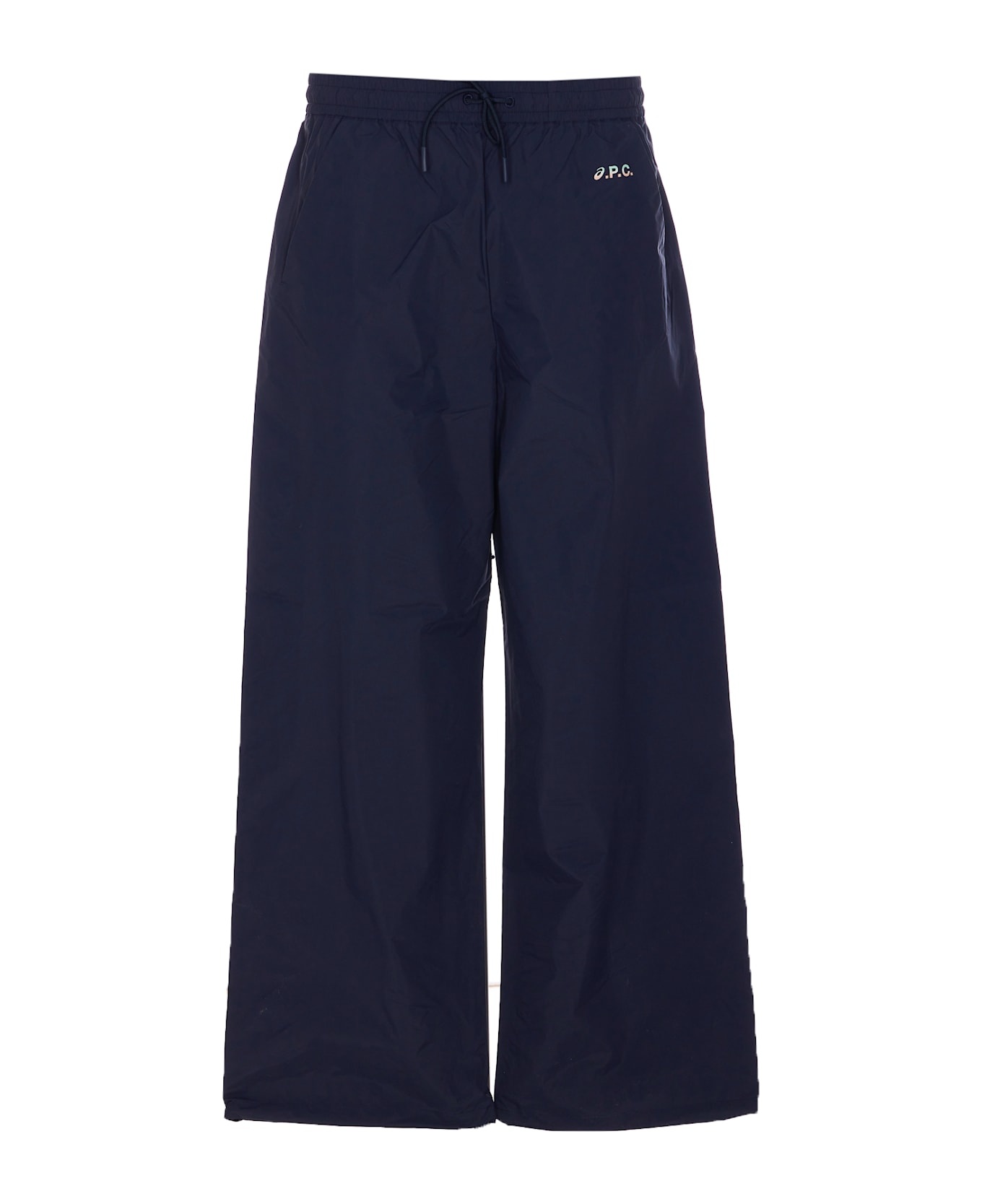A. P. C. blue track pants, elasticized on waist, coulisse closure, print logo on the front, lateral pockets, wide model Composition: 100% Polyamide Made in: China Color: Blue Size and fit: - US SIZE Model number: PSAKMM08478IAK
