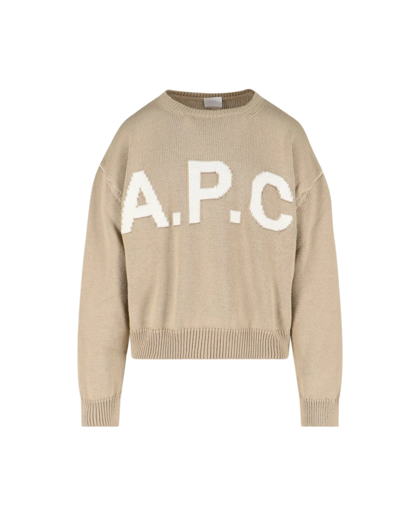 A. P. C. logo sweater in beige wool blend, knitted, crew neck, long sleeves, ribbed trims, logo inlaid on the front, straight hem. Composition: 50% Wool, 50% Acrylic Made in: Romania Color: Beige Size and fit: - Vestibilita regolare Model number: WOASLM23009AAE