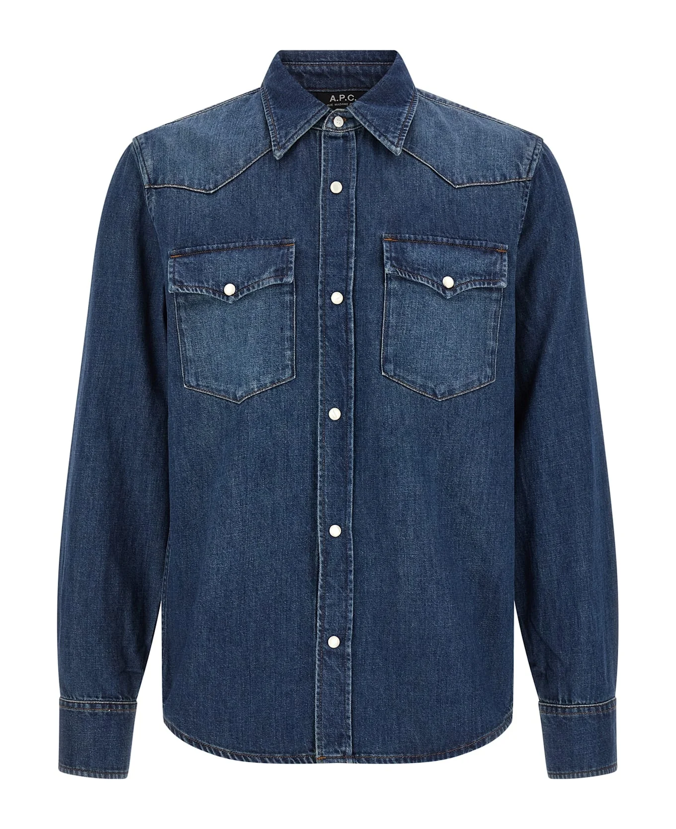 'Western' shirt in delave cotton denim with contrast stitching, pointed collar, front snap button closure, pockets, long cuffed sleeves, rounded hem. SUSTAINABLE: This product is made with organic cotton. Composition: 100% biological cotton Made in: Tunisia Color: Blue Size and fit: - true to size fit - FRENCH size Model number: COHMEH12632IAL