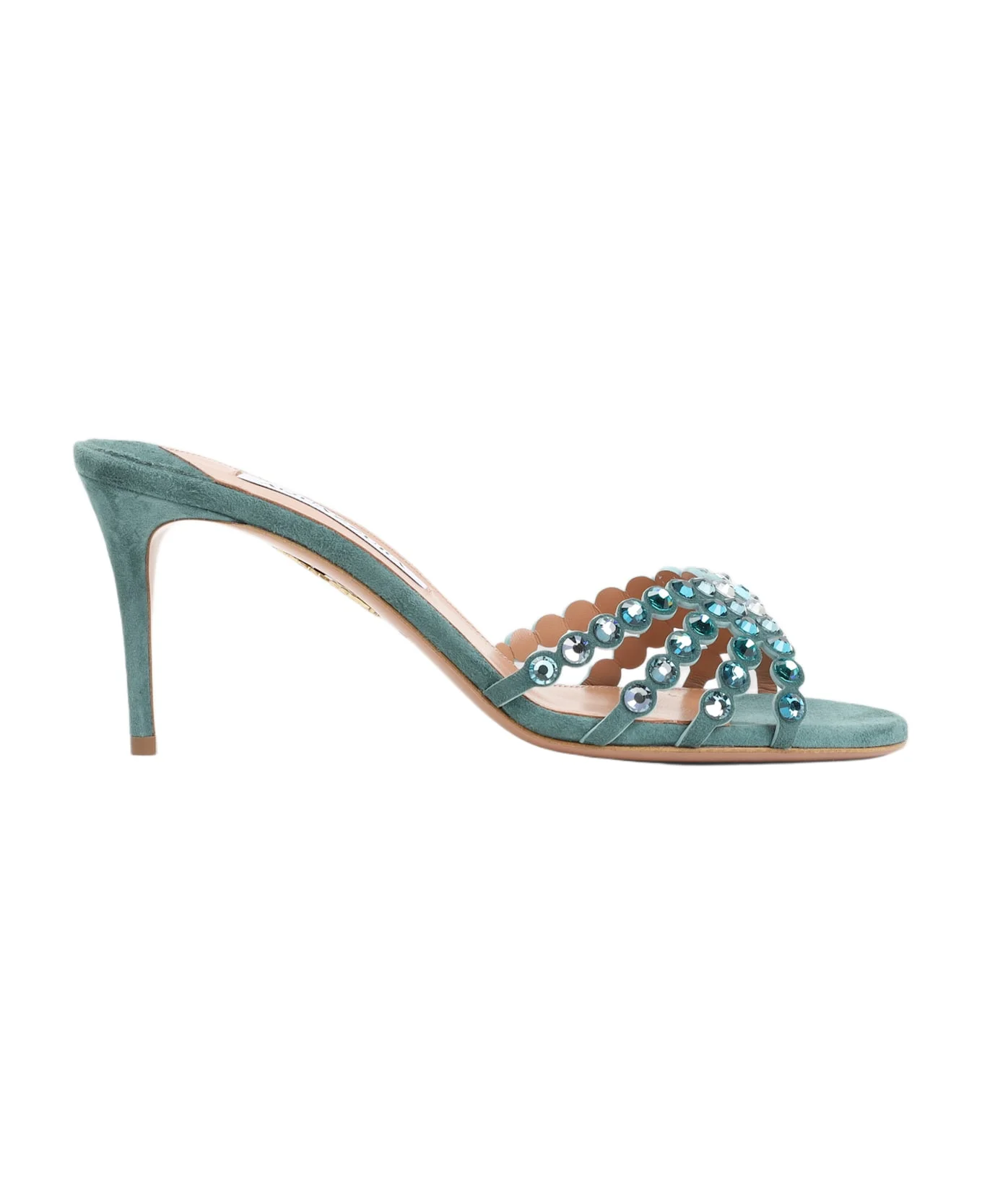 Aquazzura Light Teal Blue Kid Suede Leather Tequila Mule. Pure light teal blue kid suede leather, round opened toe, top tonal straps with tonal crystal details, slip-on style, thin high heels, leather sole. Made in: Italy Color: Lge Light Teal Size and fit: - Heel high: 7,5cm Model number: TQLMIDM0SUELGE