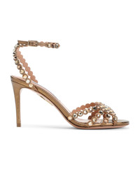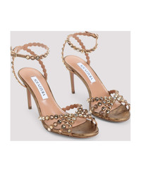 Aquazzura Brass Goat Leather Tequila Sandal. Pure brass goat leather sandal, round opened toe, top tonal straps with crystal details, ankle tonal adjustable strap with tonal crystal details, thin high heels, tonal leather sole. Made in: Italy Color: Bra Brass Size and fit: - Heel high: 8,5cm Model number: TQLMIDS0CYNBRA
