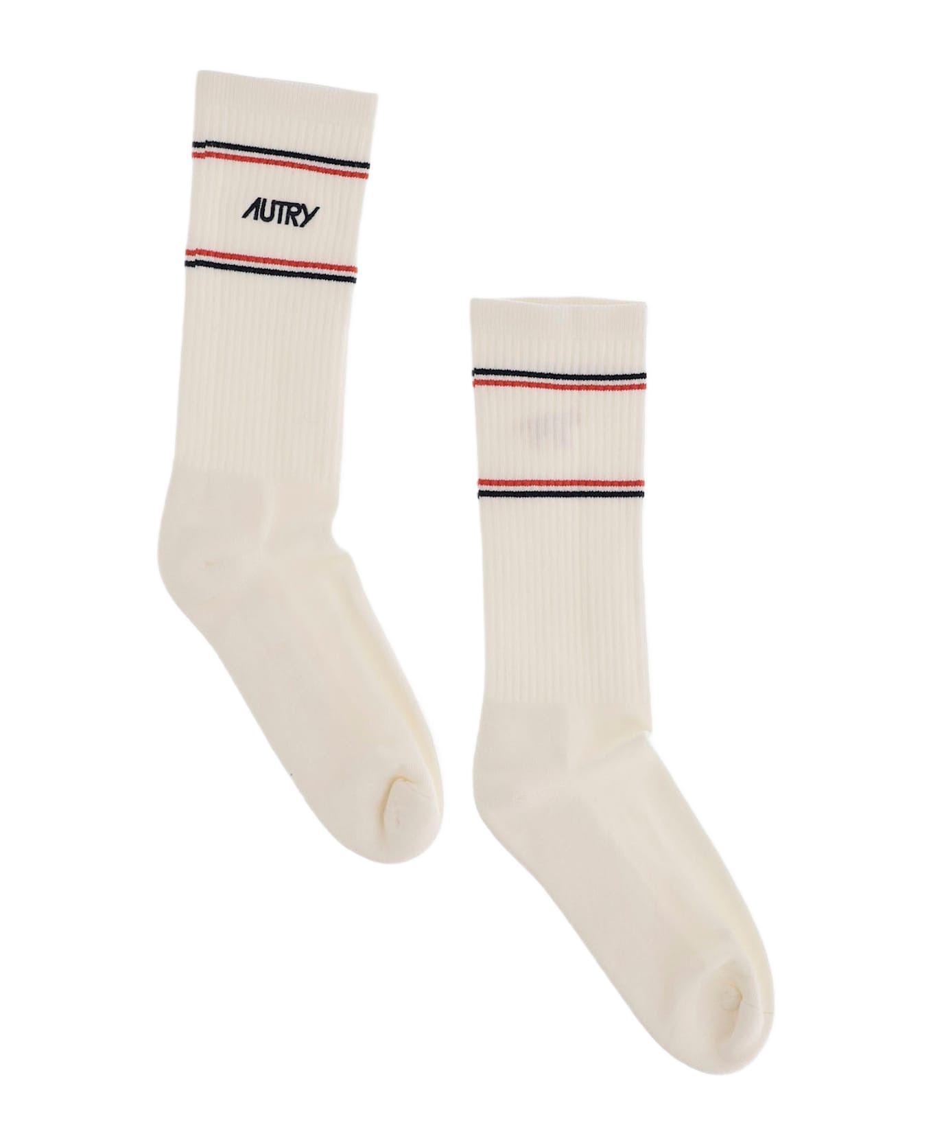 Socks made from stretch cotton blend Exclusive design created in collaboration between Autry and Maison Kitsune White base with double red and blue stripes Autry logo on one side, red Kitsune fox on the other Elasticated cuff White, multi Made in Portugal Composition: 83% cotton, 15% polyamide, 2% elastane Made in: Portugal Color: White Size and fit: - Size M. Model number: SOPUMK4WWHITE