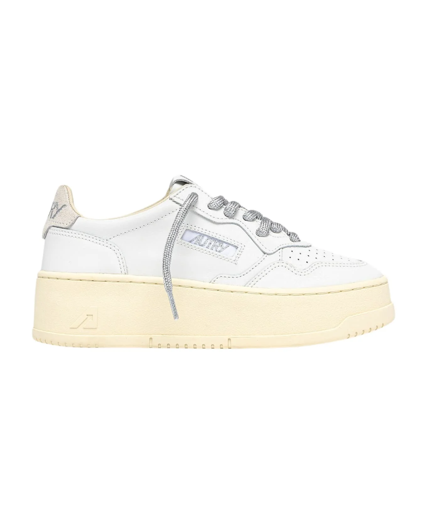 Sneakers made of leather and suede Front lacing Round toe Logo details Rubber platform sole Sole height 4 cm White, silver Made in Indonesia Composition: 100% leather Made in: Indonesia Color: White Size and fit: - Size 37 EU - Model number: PTLWSW02LEATSWOLLWHTSILV