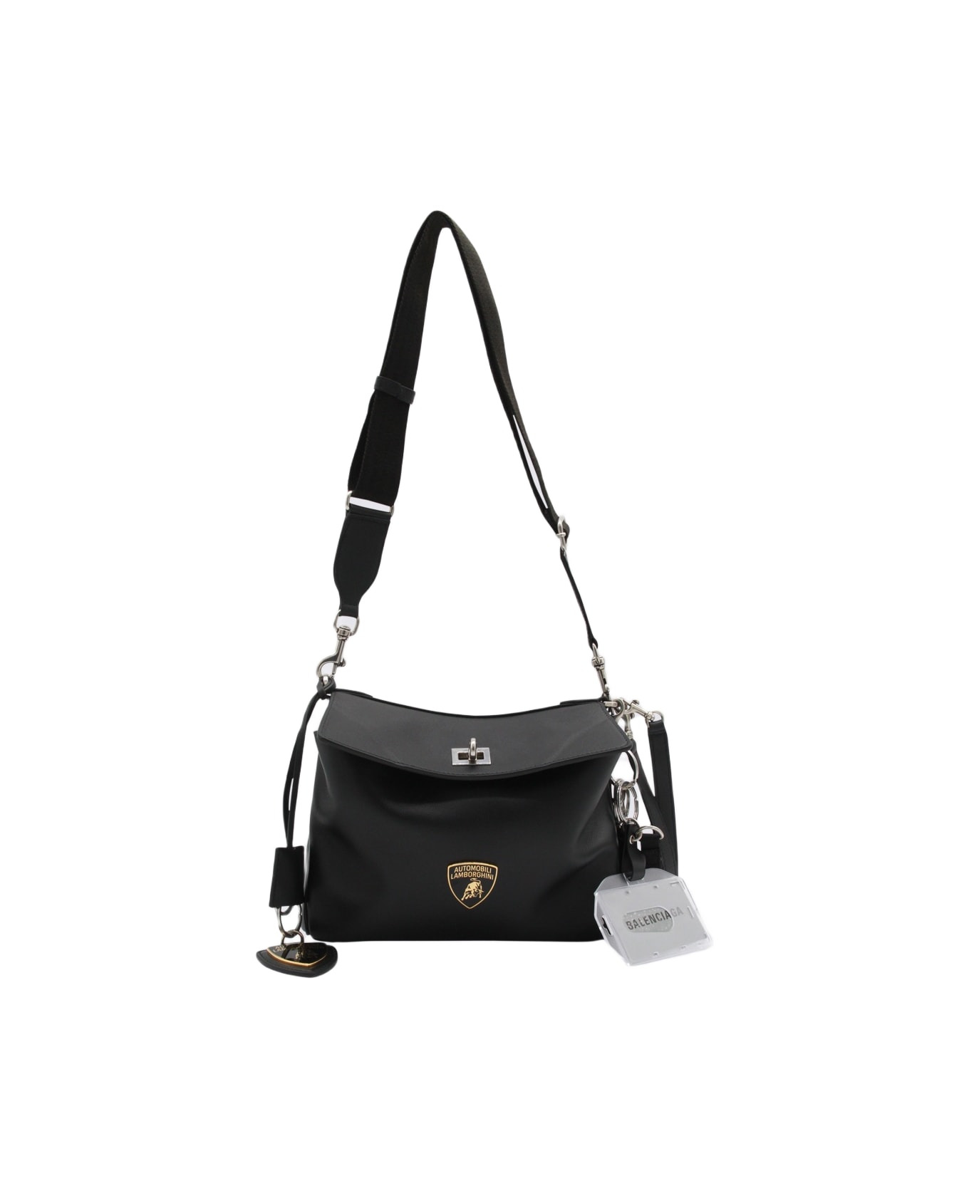 Black leather Lamborghini Rodeo shoulder bag from Balenciaga featuring adjustable and removable shoulder strap, frontal Lamborghini logo, frontal pocket, twist-lock closure, rear pockets, main compartment and internal pockets. Composition: _, 100% Le Made in: Italy Color: Black Size and fit: - WIDTH: 24,3 CM - HEIGHT: 17 CM - DEPTH: 10,9 CM - Model number: 8275832AB0H1000