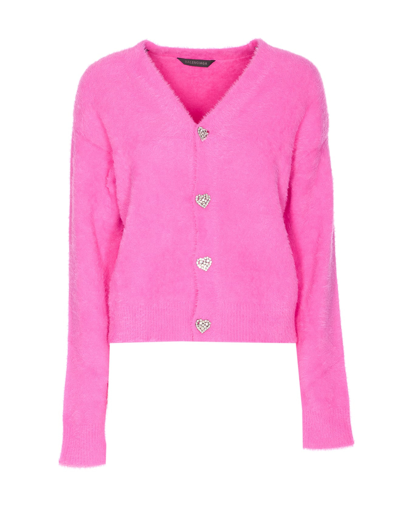 Balenciaga pink cardigan with frontal heart crystals buttons closure, long sleeves, v-neck Composition: 99% Polyamide, 1% Elastane Made in: Italy Color: Pink Size and fit: - US SIZE Model number: 849501T62445630