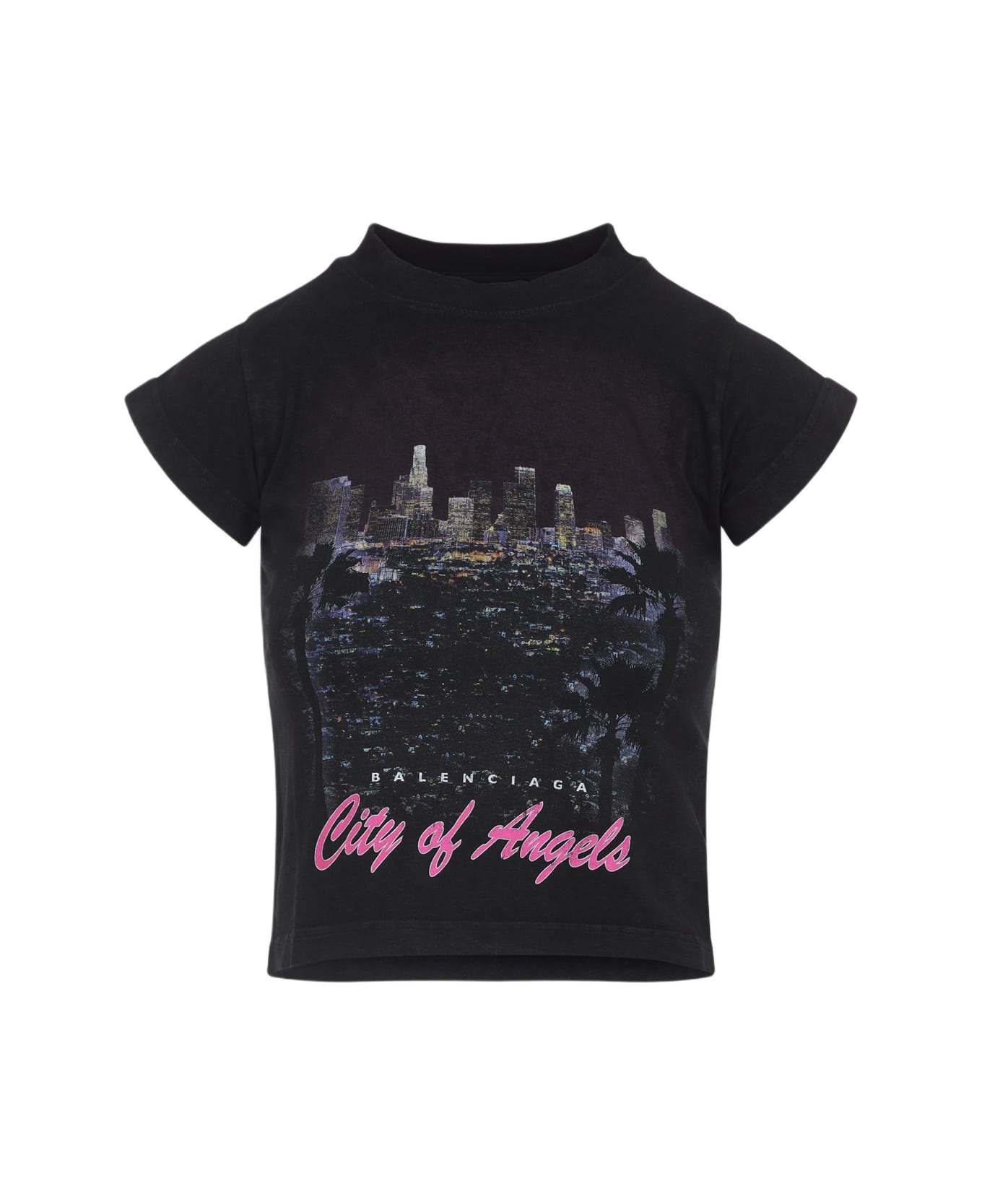 Balenciaga City of Angels Black Cotton T-shirt. Crafted from faded and washed black cotton jersey, round ribbed neckline, City of Angels graphic print on the front, short sleeves with turn-up edges, straight hem, cropped length. Made in: Portugal Color: Faded Washed Black Model number: 807341TSVR51041