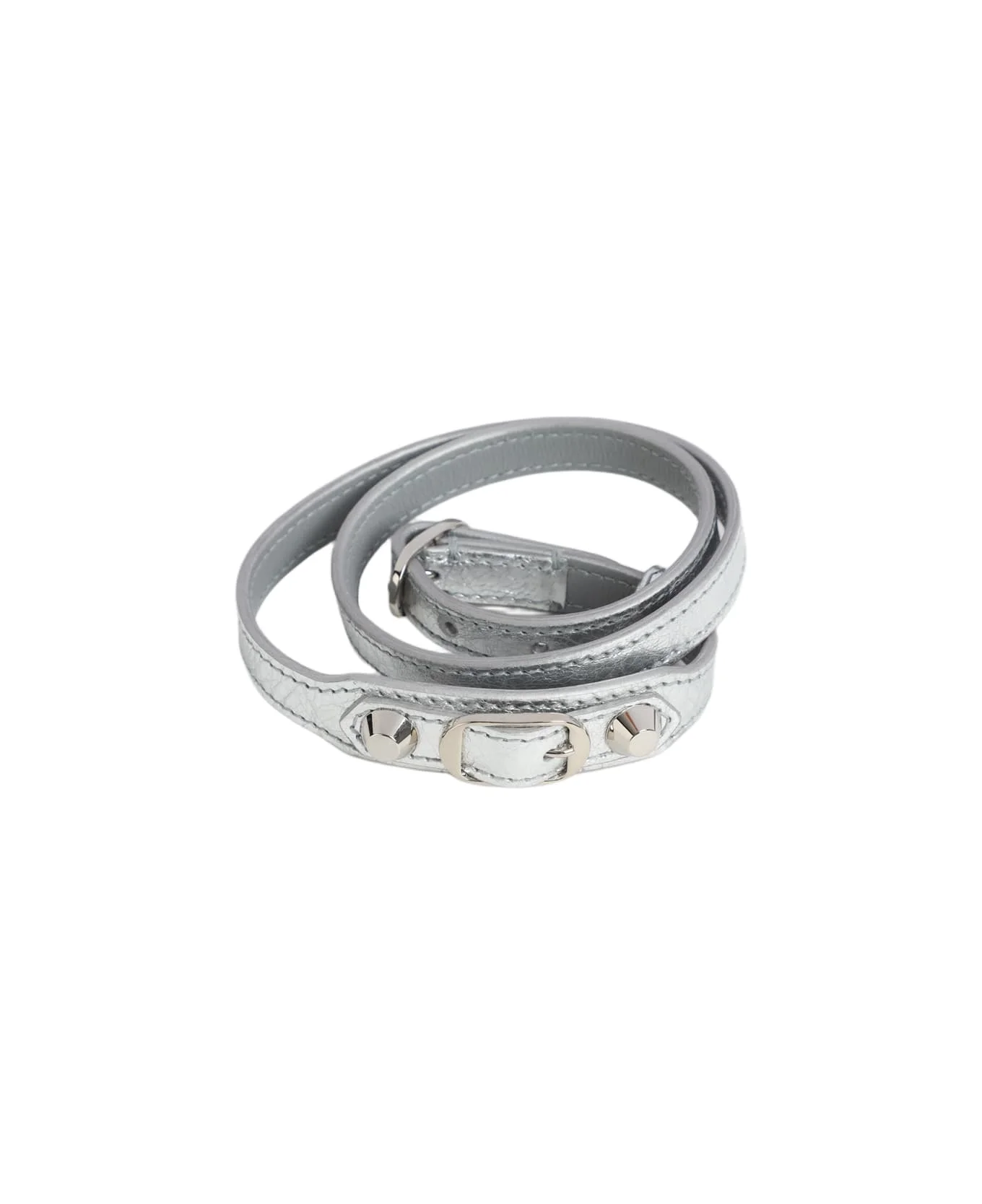 Balenciaga Silver Grey Leather City Triple Bracelet. Pure silver grey leather bracelet, adjustable design, front silver-tone buckle detail, front studded details, three-wrap design, silver-tone hardware. Made in: Italy Color: Silver Model number: 832876TZDMS7213