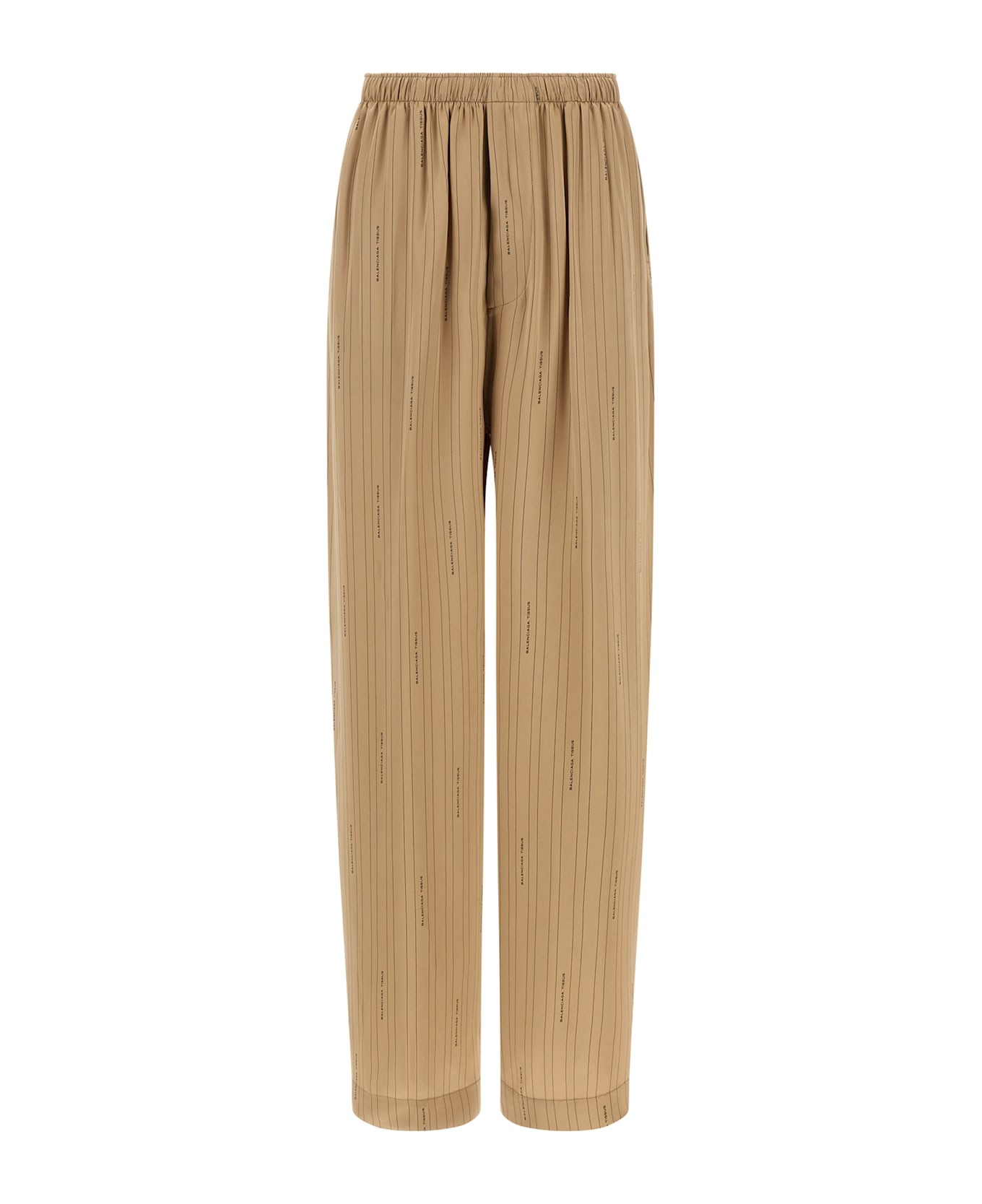 'Coocon' striped fluid viscose pants with all-over 'Balenciaga Tissus' logo, wide leg, adjustable drawstring elastic at the waist, button flap, pockets. Composition: 100% viscose Made in: Portugal Color: Beige Size and fit: - large fit - FRENCH size Model number: 847154TSLA62684
