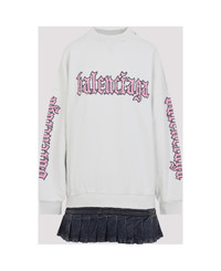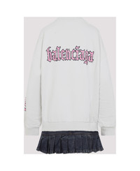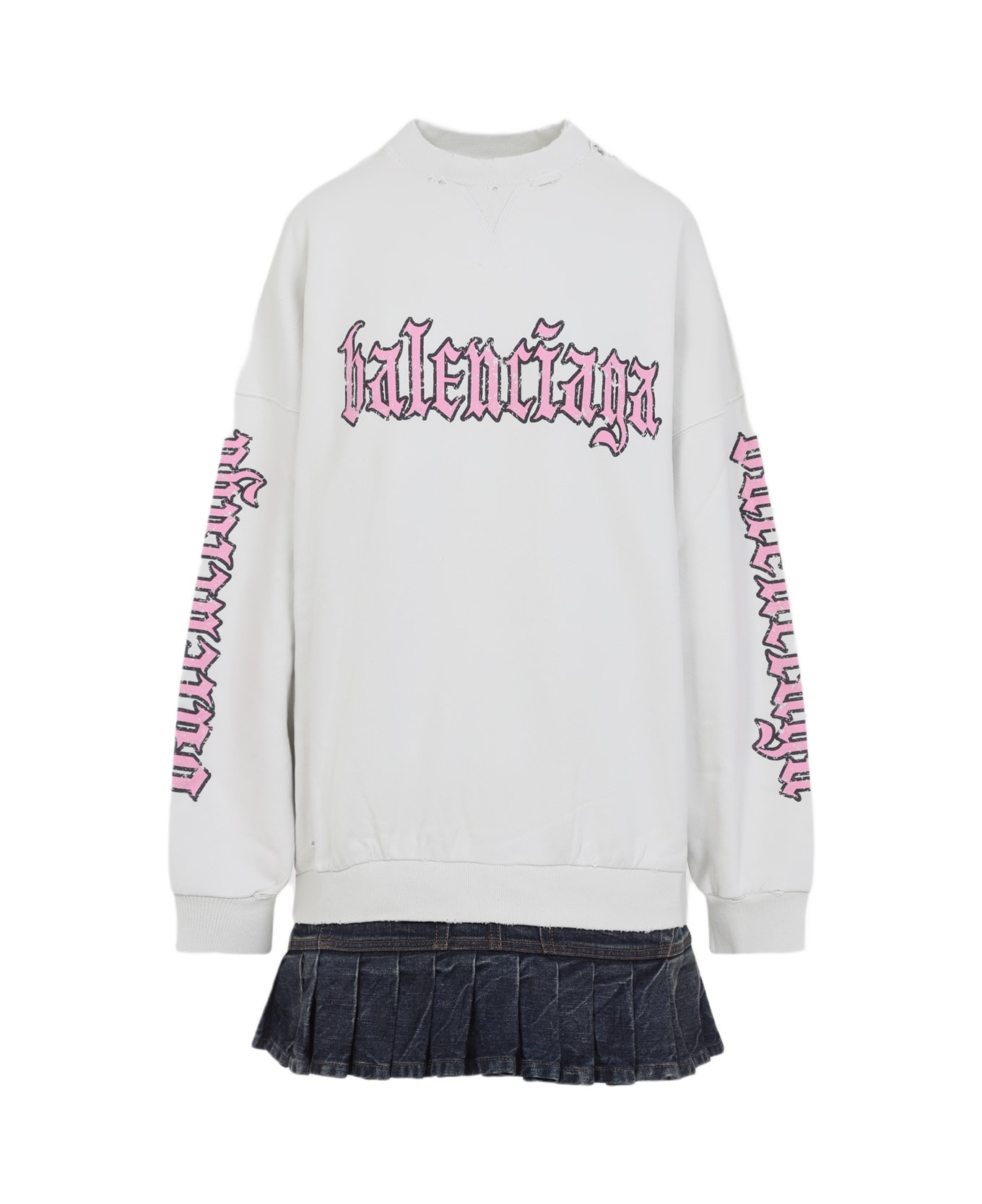 Balenciaga Hybrid White Cotton Mini Dress. Crafted from dirty white cotton, distressed effect all over, logo stamped on the chest, along the sleeves and back, round neckline, dropped shoulders, long sleeves with ribbed cuffs,black cotton denim pleated skirt detail. Made in: Portugal Color: Dirty White Model number: 838718TSVW59012