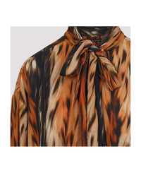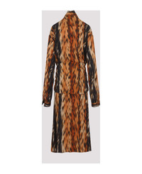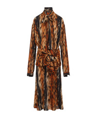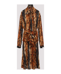 Balenciaga Brown Knotted Dress. Crafted in polyester fabric, stand-up collar, front bow detail, waist knotted, tonal belt, dropped shoulders, long sleeves, buttoned cuffs, midi-length, straight hem, draped effect. Brown and black animal design. Made in: Italy Color: Brown Model number: 814346TRLD72135