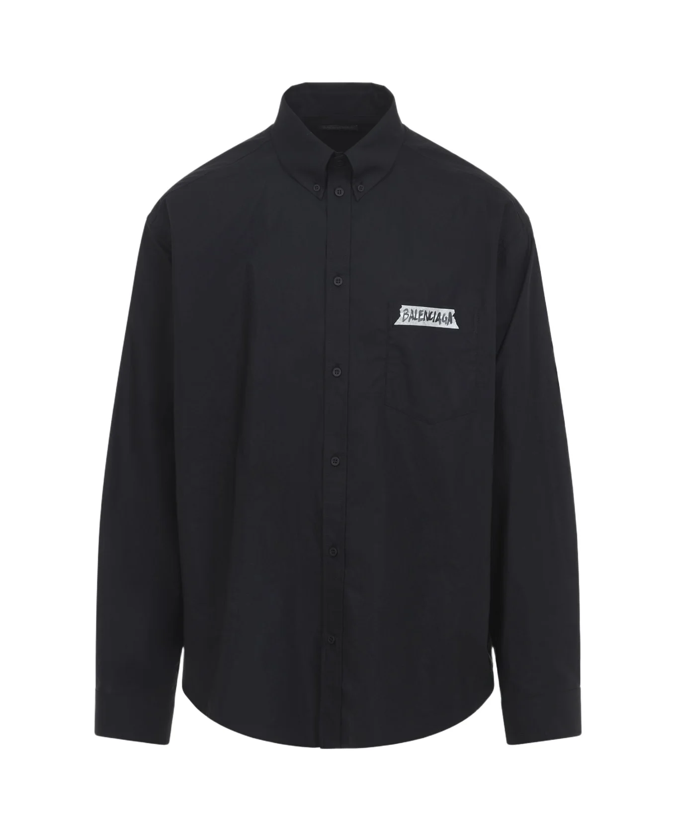 Balenciaga LS Large Fit Black Cotton Shirt. Large fit shirt crafted from black cotton poplin, featuring a button-down collar, front button fastening, one patch pocket on the chest, Masking Tape logo stamped on the front and back, long sleeves with buttoned cuffs, back yoke, and a round hem. Made in: Italy Color: Black Model number: 857809TRM281000