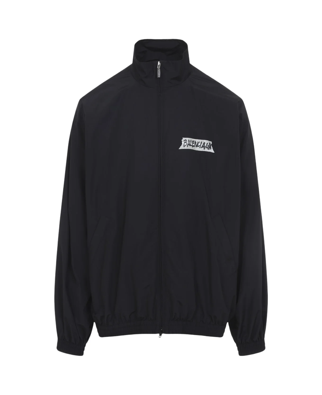 Balenciaga Medium Fit Black Cotton Jacket. Crafted from black cotton blend poplin, featuring a stand collar, two-way zip fastening, two front pockets, Masking Tape logo on the front and back, long sleeves, elastic cuffs and hem. Made in: Italy Color: Black Model number: 857713TPQ381000