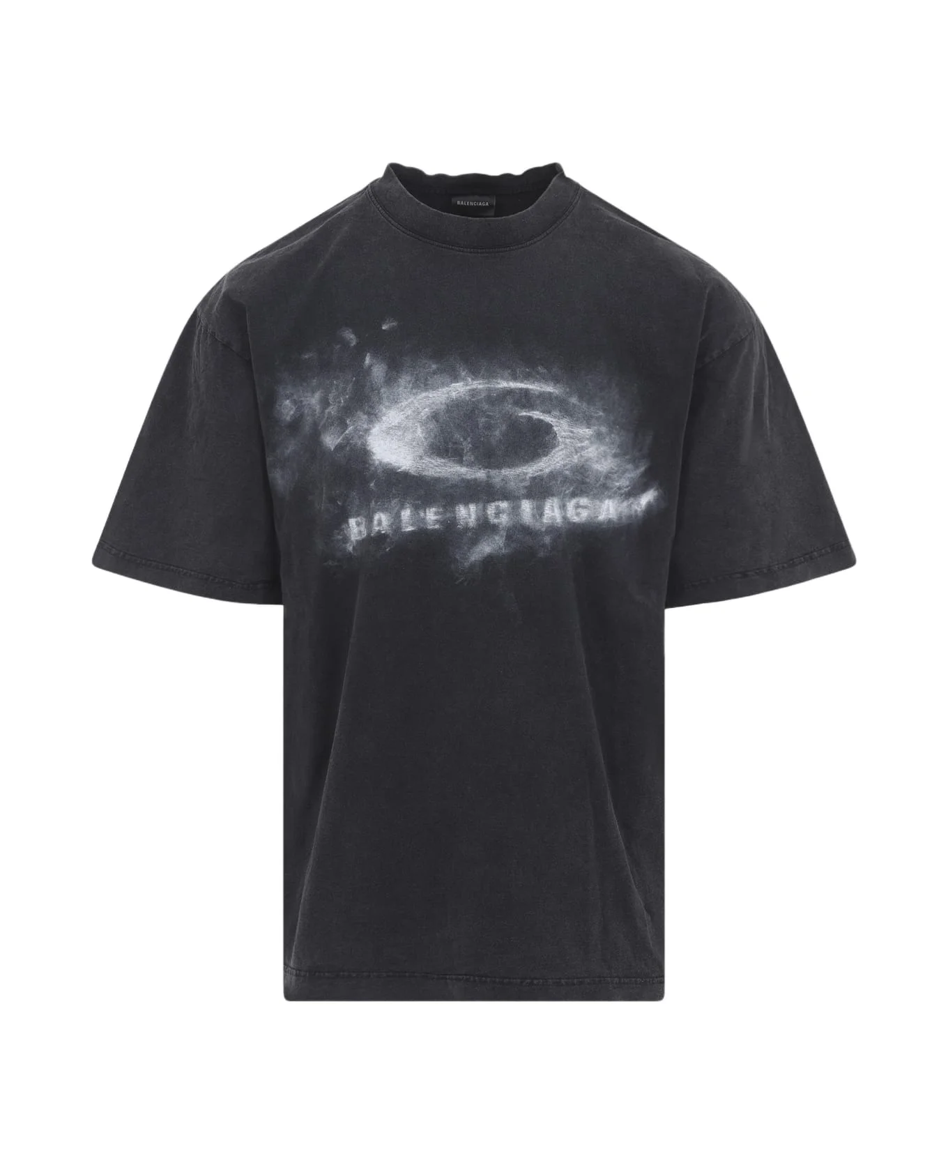 Balenciaga Washed Black Cotton Medium Fit T-Shirt. Pure washed black cotton t-shirt, round neck, chest contrasting white logo, short sleeves, straight hem. Made in: Portugal Color: Washed Black White Model number: 764235TTVN59034