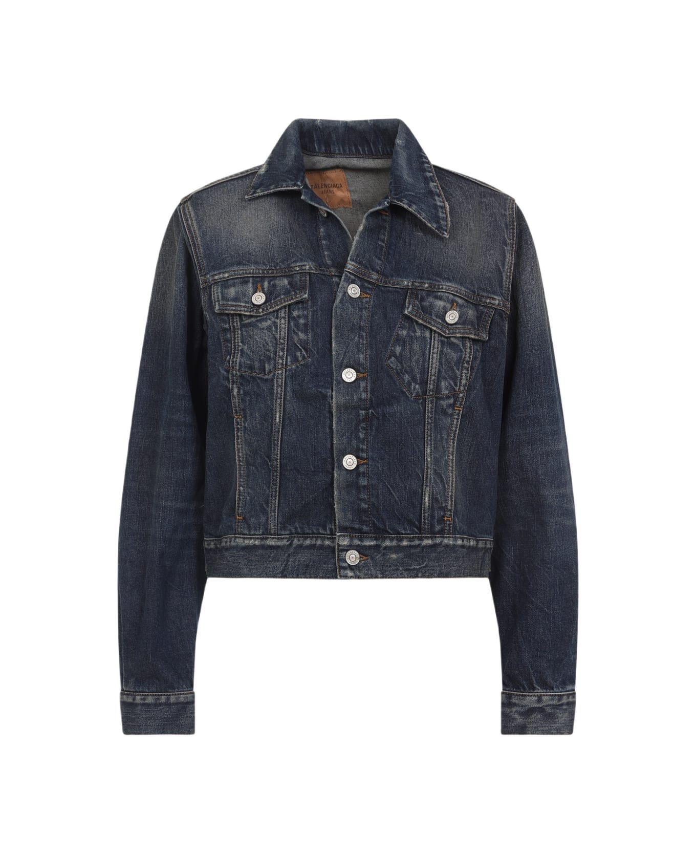 Balenciaga Off-Shoulder Dark Blue Cotton Jacket. Bleached blue cotton denim, pointed collar, front button fastening, two flap pockets placed on the chest, long sleeves with buttoned cuffs, button tabs at the back edges, unlined. it can be worn off shoulder. Made in: Italy Color: Dark Blue Model number: 838699TSW725002