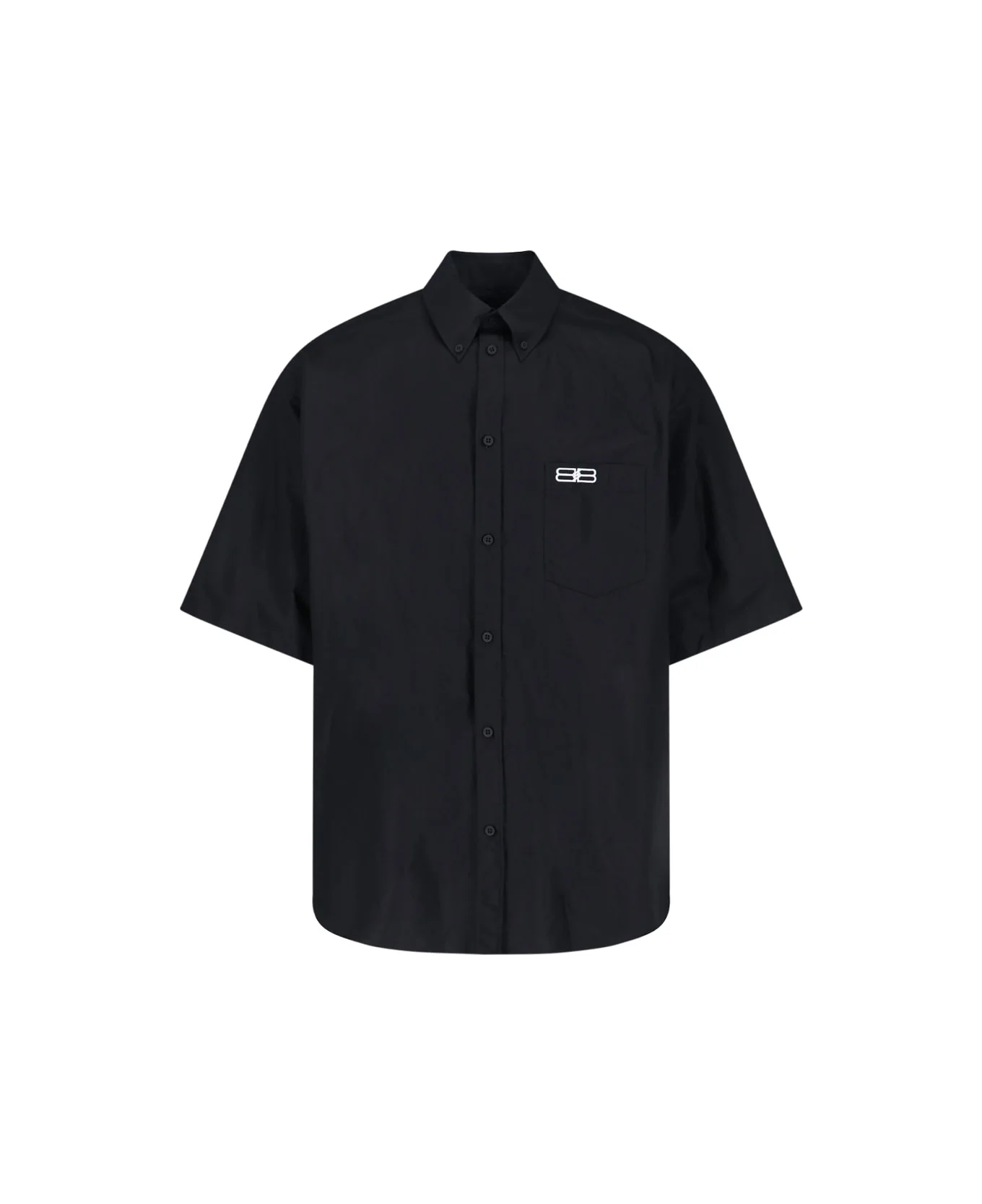 Balenciaga oversized shirt in black cotton with classic button-down collar, button closure, short sleeves, patch pocket with contrasting logo embroidery detail on the chest, and rounded hem. Composition: 100% Cotton Made in: Italy Color: Black Size and fit: - Vestibilita oversize Model number: 850829TRM281000