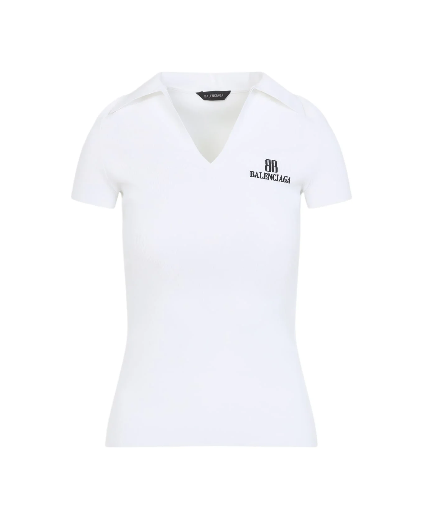 Balenciaga White Polo. Crafted in viscose and polyester blend, pointed collar, v-neck, chest contrasting black embroidered lettering logo, short sleeves, straight hem. Made in: Italy Color: White Black Model number: 835501T52319040