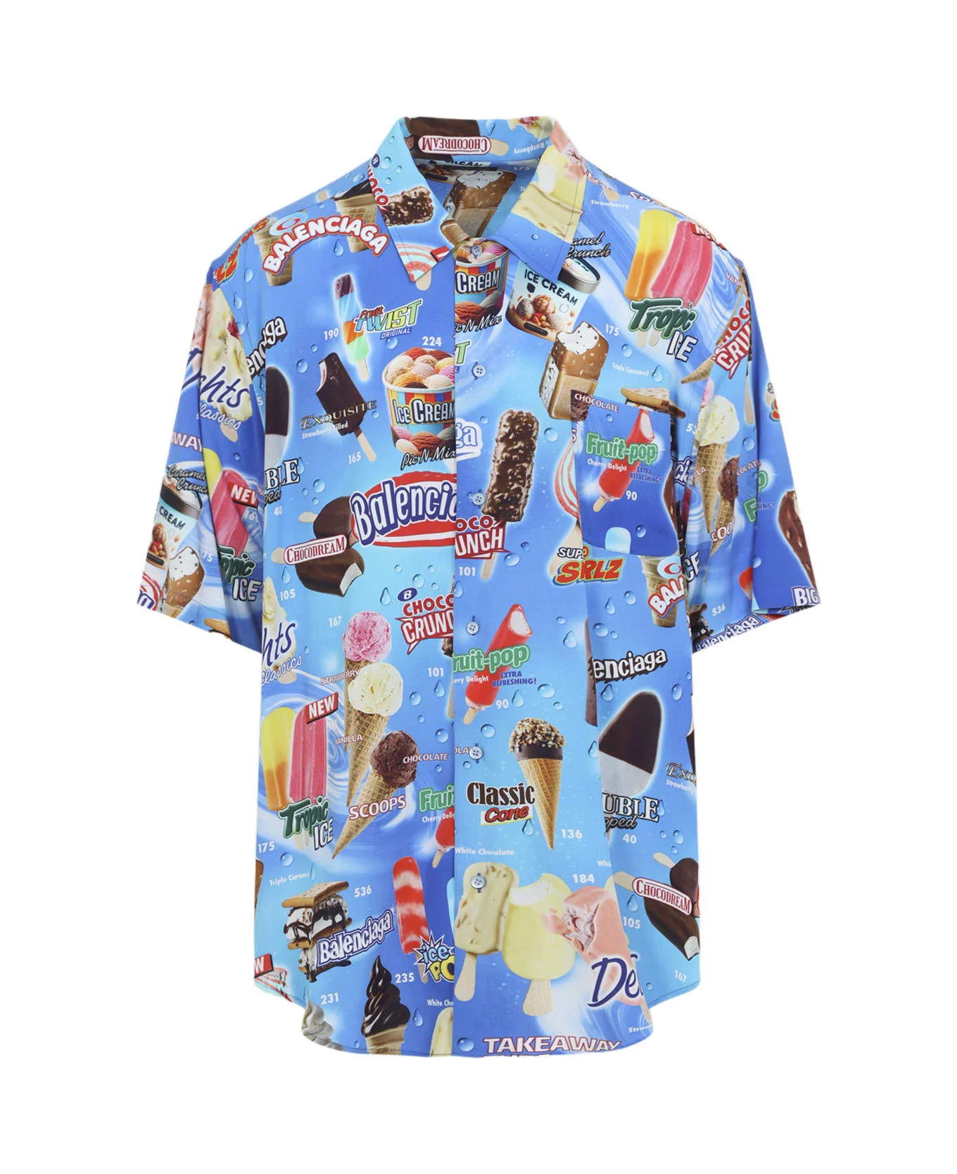 Balenciaga SS Minimal Blue Viscose Shirt. Crafted from light blue viscose poplin with an all-over signature Sweet Treat print, featuring a pointed collar, front button fastening, a patch pocket on the chest, short sleeves, and a round hem. Made in: Italy Color: Blue Model number: 852334TTL244011