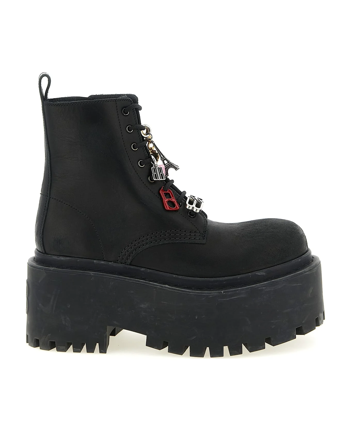 'Strike' ankle boots in soft used-effect bull leather, amphibious model, rounded toe, laces closure with multicolor and multimaterial removable charms, side zip, serrated rubber platform sole. Composition: 100% bull leather (Bos Taurus) Made in: Italy Color: Black Size and fit: - EU WOMAN - Heels: 8 cm Model number: 859611WCDA31080