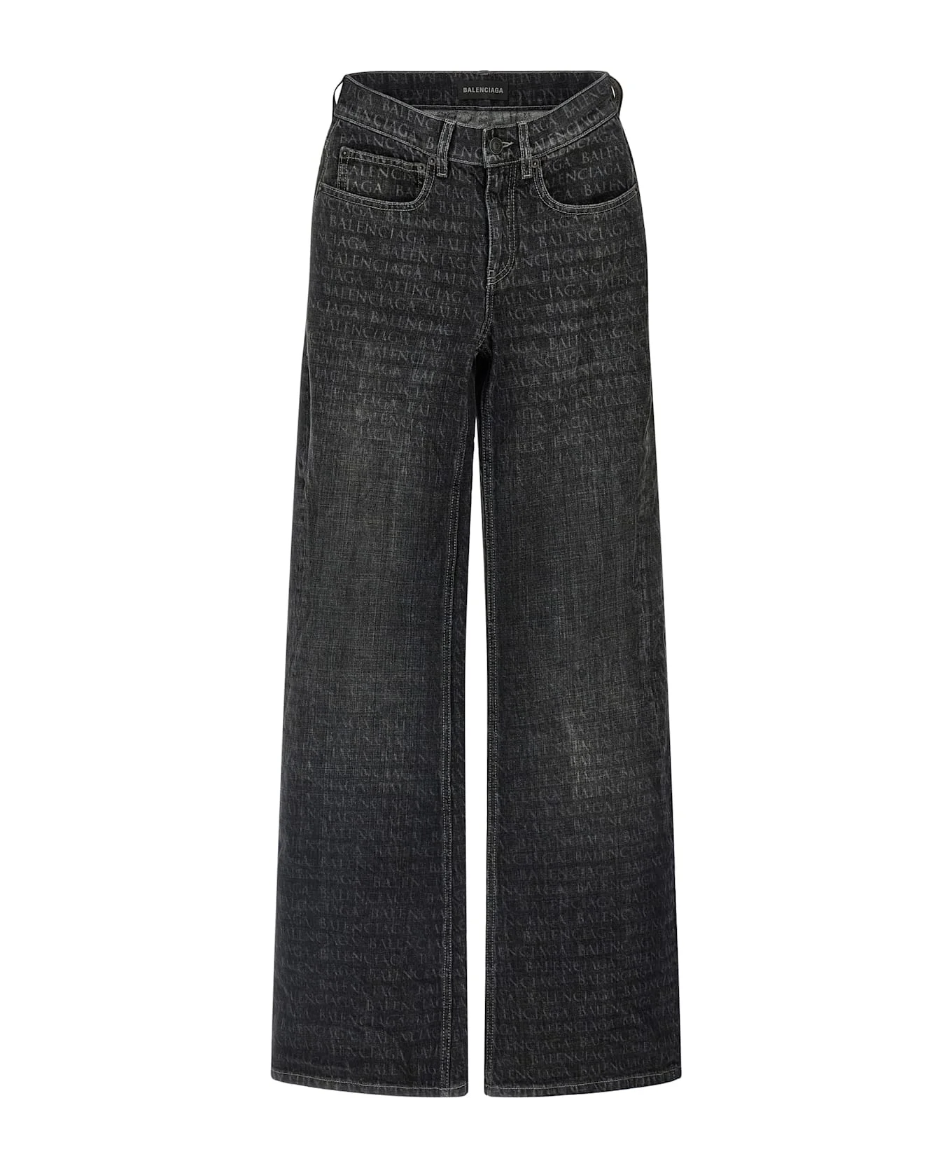 Used and wrinkled cotton denim jeans with laser monogram print, medium waist, five pockets, wide flared leg, zip and front button closure. Composition: 100% cotton Made in: Italy Color: Black Size and fit: - true to size fit Model number: 852328TTWA51037