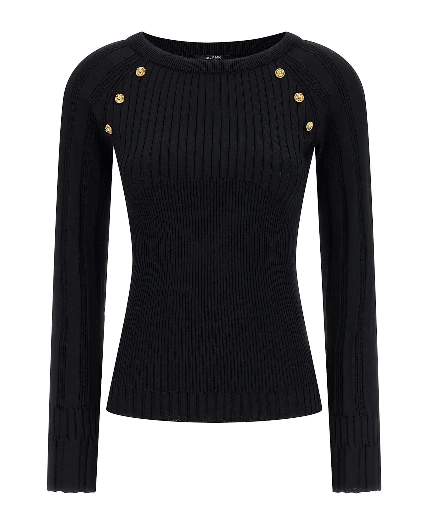 Stretch viscose sweater, crew neck, 3 symmetrical side 'Testa di leone' buttons, long sleeves. Composition: 75% viscose, 25% polyamide Made in: France Color: Black Size and fit: - True to size fit French sizing Model number: GF1ARA60KJ450PA
