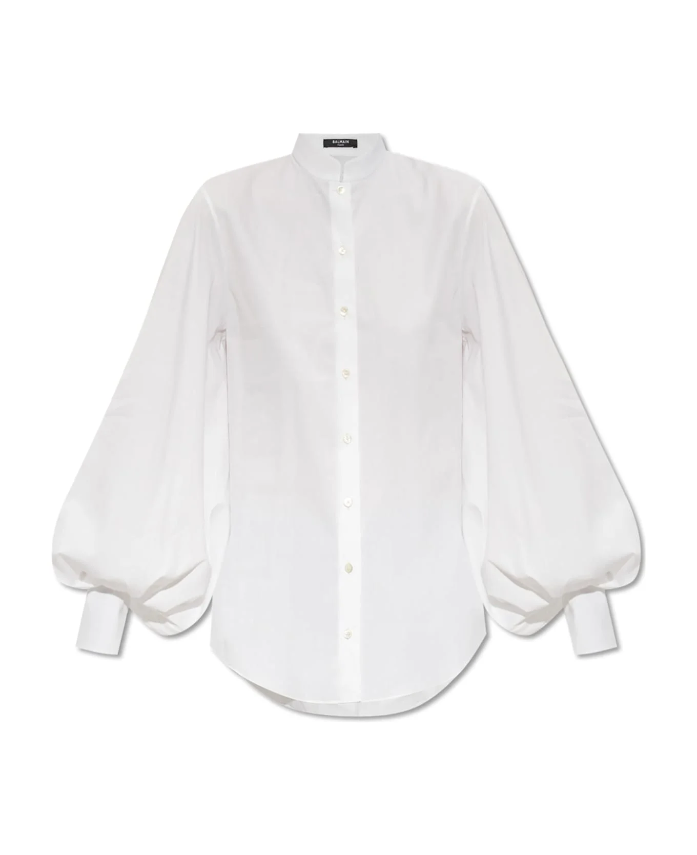 Introducing the Cotton Shirt by Balmain, a refined fusion of timeless elegance and contemporary flair. Meticulously crafted from premium cotton, this shirt offers exceptional breathability, softness, and unparalleled comfort for your wardrobe's foundation. The design features a classic, subtly elongated silhouette with gracefully rounded front and back hems, tastefully concealing the hips for a flattering effect. Voluminous balloon sleeves, distinguished by striking fullness, culminate in broad cuffs extending to mid-hand and fastening with lustrous pearl-like buttons a detail that elevates its sophisticated look. Instead of a traditional collar, a chic mandarin stand-up collar underscores the shirt's modern, minimalist allure. Embodying the Parisian spirit and avant-garde vision of the legendary house of Balmain, this piece masterfully celebrates both heritage craftsmanship and innovative design. Why choose this product? Crafted from the finest quality cotton for superior comfort Statement balloon sleeves and refined cuffs for a distinguished aesthetic Contemporary mandarin collar accentuates modern minimalism Heritage design by one of France's most prestigious fashion houses Lustrous pearl-like buttons add a subtle touch of luxury Composition: 100% Cotton 100% Cotton Composition: 100% Cotton Color: White Model number: FF1HU681CG220FA
