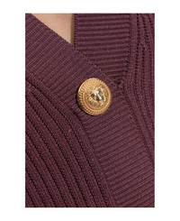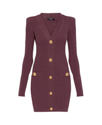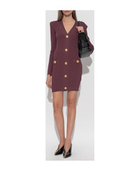 This exquisite Tunic Dress with Ornate Buttons by Balmain epitomizes refined Parisian sophistication. Skillfully crafted from a supple, lightly elastic knit, the dress boasts a distinctive vertical ribbed pattern that elegantly contours the feminine silhouette. The figure-hugging mini length, elongated fitted sleeves, and a deep V-neckline evoke both allure and timeless class. The standout feature striking, oversized gold buttons are intricately embossed with a lion's head motif framed by a decorative ring, an unmistakable insignia of Balmain's lavish heritage. Designed for both elegance and comfort, this dress merges legendary couture artistry with contemporary flair. Why choose this product? Signature Balmain craftsmanship and heritage Luxurious viscose-blend knit for a flawless fit Iconic gold buttons with bold lion's head detail Keeps its shape while providing exceptional comfort Sculpted to flatter the silhouette with effortless glamour Composition: 84% Viscose 84% Viscose 16% Polyester 16% Polyester Color: Purple Model number: FF0R8033KJ155DR