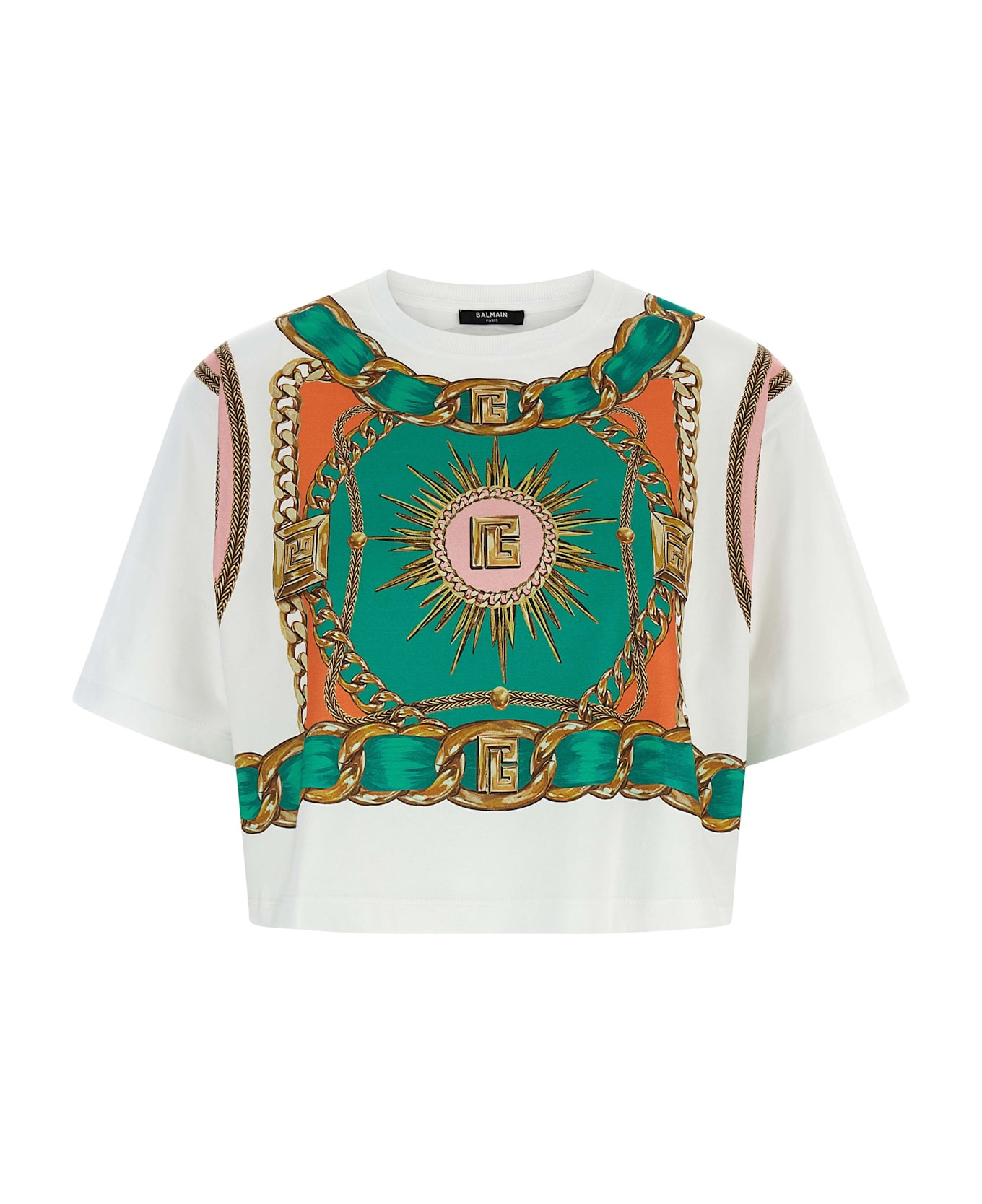 Cotton cropped T-shirt with 'Balmain Foulard' print on the front and back, crew neck, and short sleeves with dropped shoulders. Composition: 100% cotton Made in: Portugal Color: Multicolor Size and fit: - true to size fit Model number: FF1EE020GF01GSR