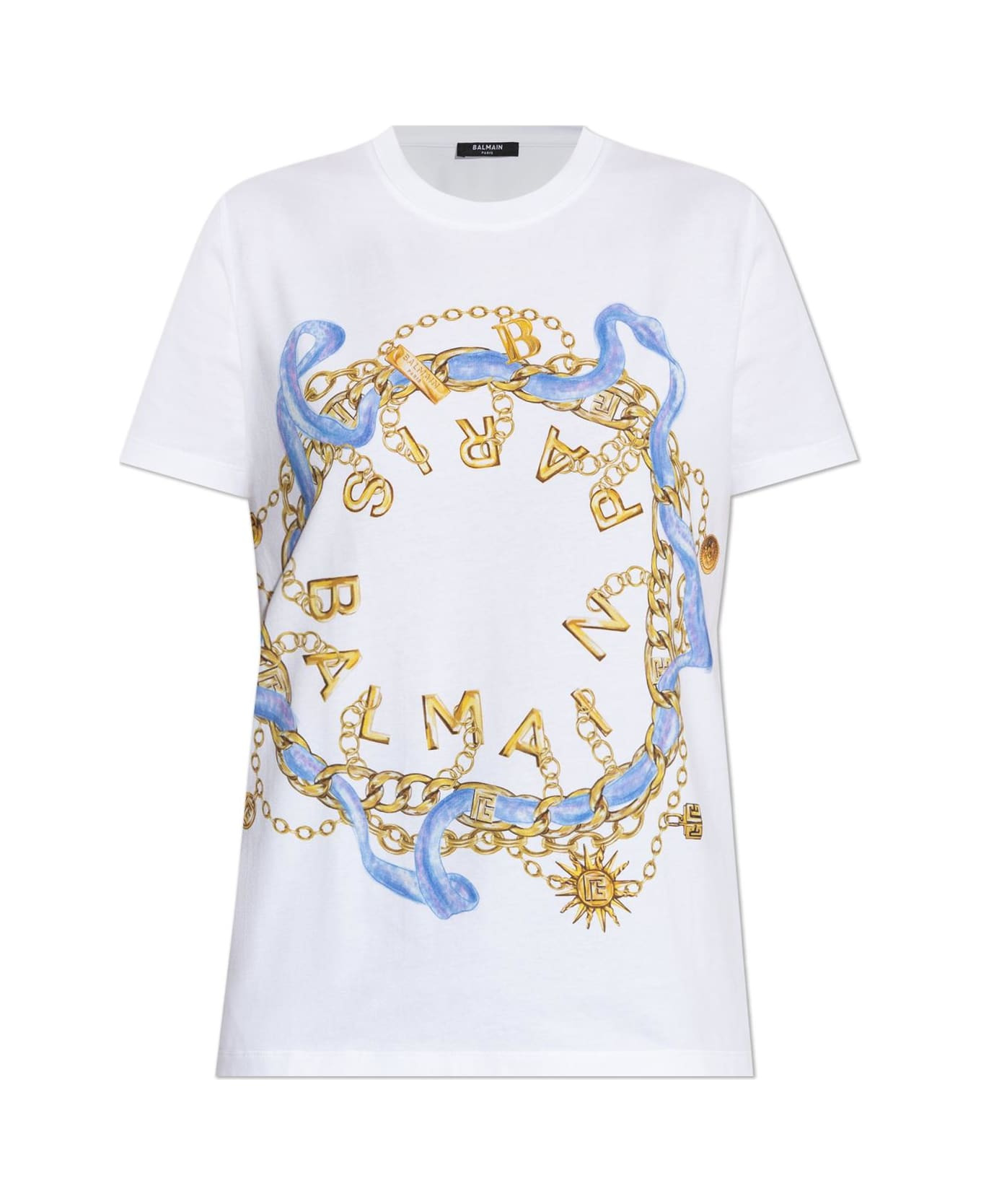 Exuding modern sophistication, this white T-shirt by BALMAIN PARIS stands as a statement piece for discerning wardrobes. Crafted from smooth, ultra-premium cotton, its classic, subtly relaxed silhouette is complemented by a graceful crew neckline and short sleeves, ensuring effortless refinement with every wear. The front boasts a vivid, central print luxurious golden chains and dynamic blue ribbons entwine, punctuated by opulent jewelry motifs such as a bespoke medallion, radiant golden charms, and a sunburst accent. Scattered letters ingeniously compose the iconic BALMAIN PARIS logo, affirming its exclusive heritage and unmistakable designer provenance. Dlaczego warto kupi ten produkt? Luxuriously soft, high-grade cotton for lasting comfort Iconic and intricate front print, embodying Parisian couture artistry Timeless, versatile silhouette suitable for distinctive styling Signature designer detailing for elevated exclusivity An essential piece from one of France's most prestigious fashion houses Composition: 100% Cotton Made in: Italy Color: Gwj Blanc Bleu Ciel Or Model number: FF1EF000GF09