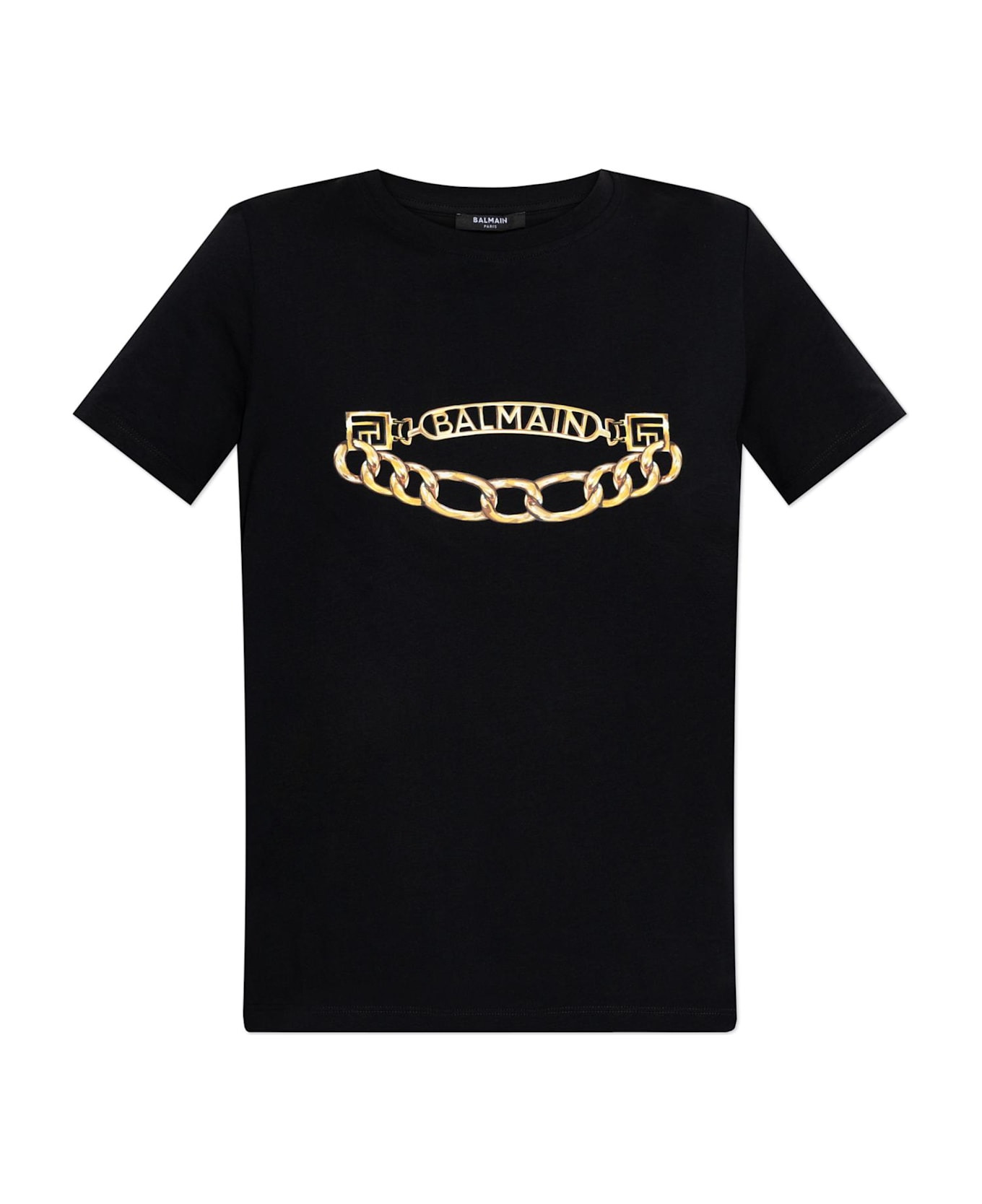 Immerse yourself in sophistication with this Balmain Printed T-Shirt, a refined essential from one of France's most illustrious fashion houses. Crafted from luxuriously soft black cotton, the classic, gently tailored silhouette features short sleeves and a timeless crew neckline, beautifully flattering the female figure. The commanding feature is a bold, gold-toned print: an exquisitely stylized chain encircling the iconic BALMAIN insignia. This dazzling emblem, inspired by the house's tradition of enhancing feminine contours and embracing contemporary rock allure, lends an unmistakable air of exclusivity and Parisian glamour. Elevate any ensemble with this emblematic tribute to Balmain's youthful yet sophisticated aesthetic ideal for aficionados of expressive, designer statement pieces. Why choose this product? Crafted from premium, exceptionally soft cotton Features an exclusive gold designer motif and logo Effortlessly flatters the feminine silhouette Represents the prestige of Balmain's historic design legacy Perfect for making a bold, luxurious statement in any setting Composition: 100% Cotton Made in: Portugal Color: Ead Noir Or Model number: FF1EF004GE97
