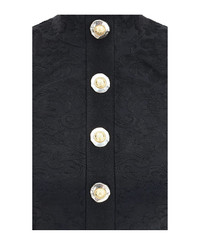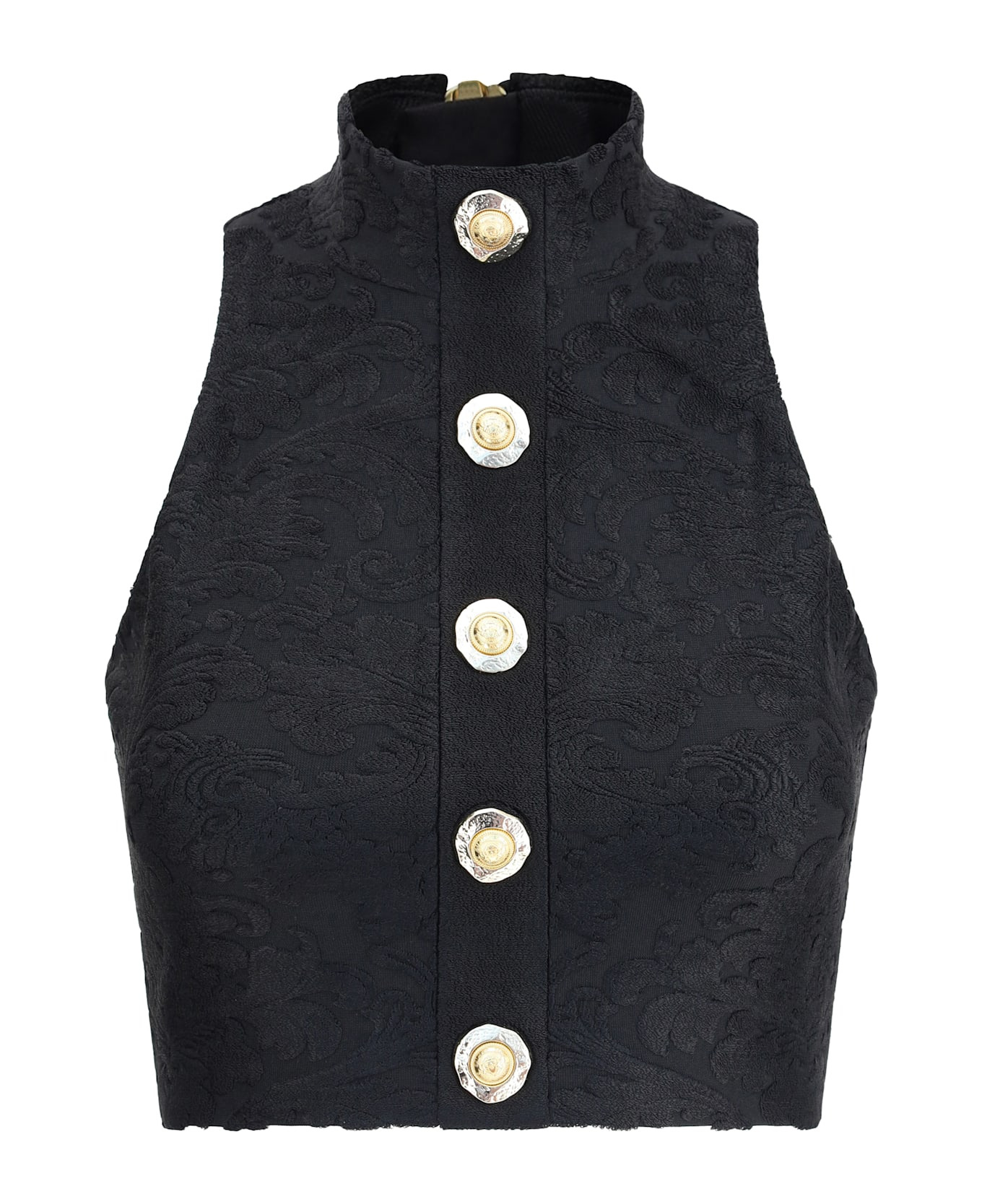 Balmain's crop top is a striking garment defined by an american neckline and a rich baroque pattern. bare shoulders enhance the bust line, while decorative metal "gold and gold coin" buttons on the front add an iconic touch. the back closure is completed with an exposed metal zipper with balmain paris engraved slider, a detail that reflects the maison's bold elegance. Composition: 65% % Viscose, 35% % Polyester Made in: France Model number: FF1AB495JK650PA