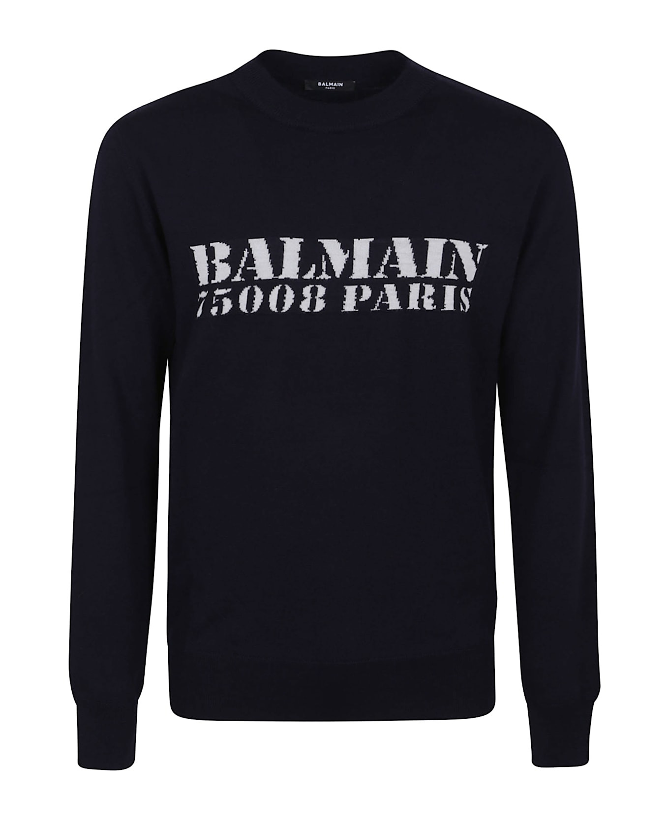 Merino wool sweater by BALMAIN. Round neck; long sleeves; contrasting ribbed trim; regular fit. Features contrasting Balmain branding on the front. Made in: Italy Color: Saj Bleu Marine Blanc Size and fit: - Regular fit, recommend you get your regular size Model number: FH1KD000KI84SAJ