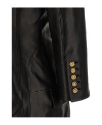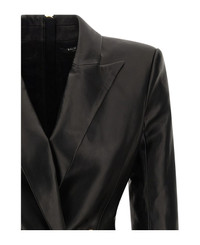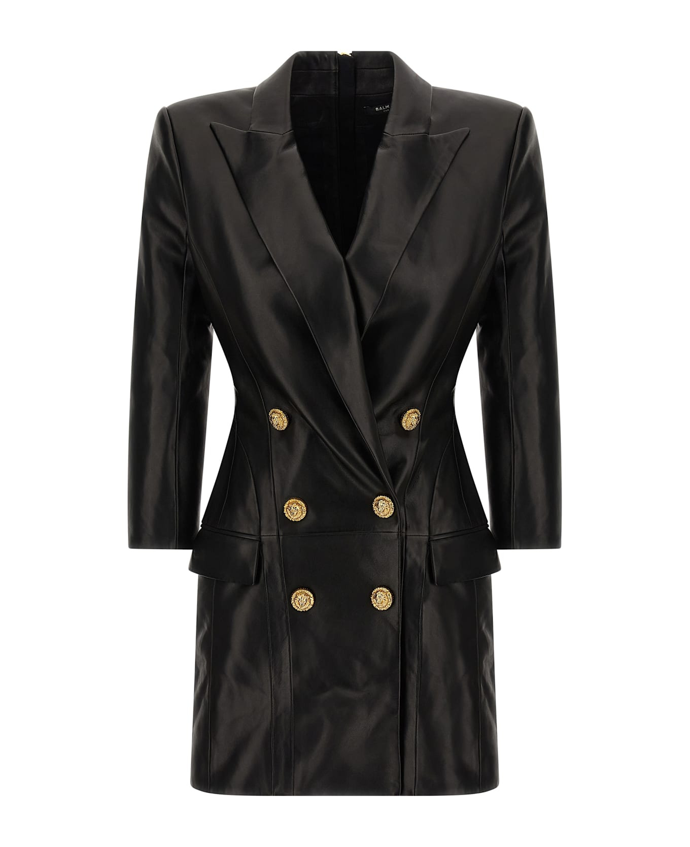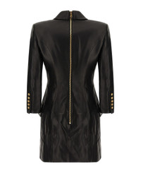 Leather mini dress with double-breasted blazer style, peak lapels, flap pockets, padded shoulder strap, long sleeves, and back zipper closure. Composition: 100% lamb leather (Ovis aries) Made in: Turkey Color: Black Size and fit: - true to size fit - FRENCH size Model number: FF0R9391LD630PA