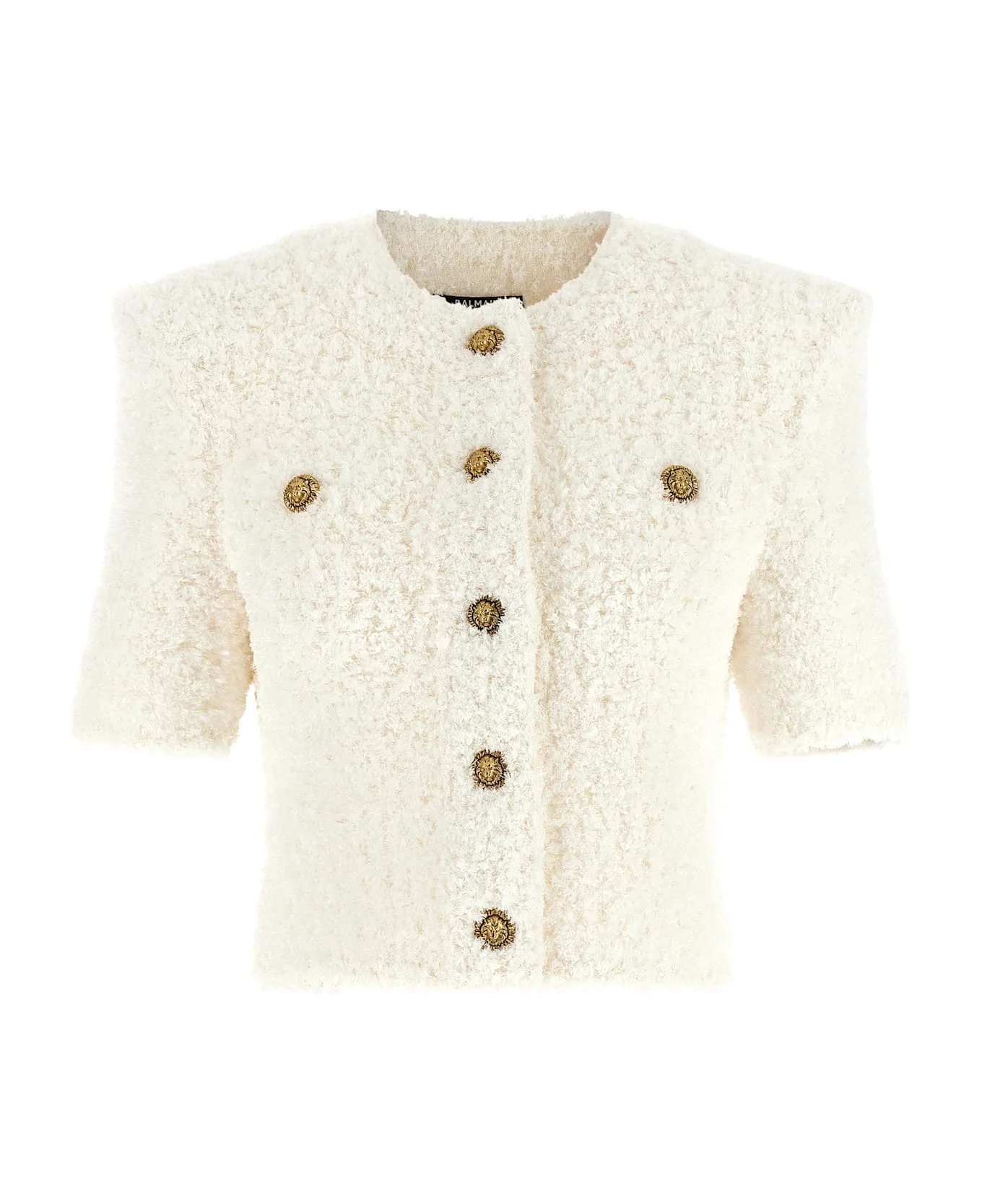 Plumetis tweed cardigan, crop model, crew neck, front metal 'Testa di Leone' button closure, trompe-l'oeil pockets, padded shoulder strap, short sleeves. Composition: 48% polyamide 31% vi 15% cotton 6% polyester Made in: France Color: White Size and fit: - slim fit - FRENCH size Model number: GF0KL290KJ890KA