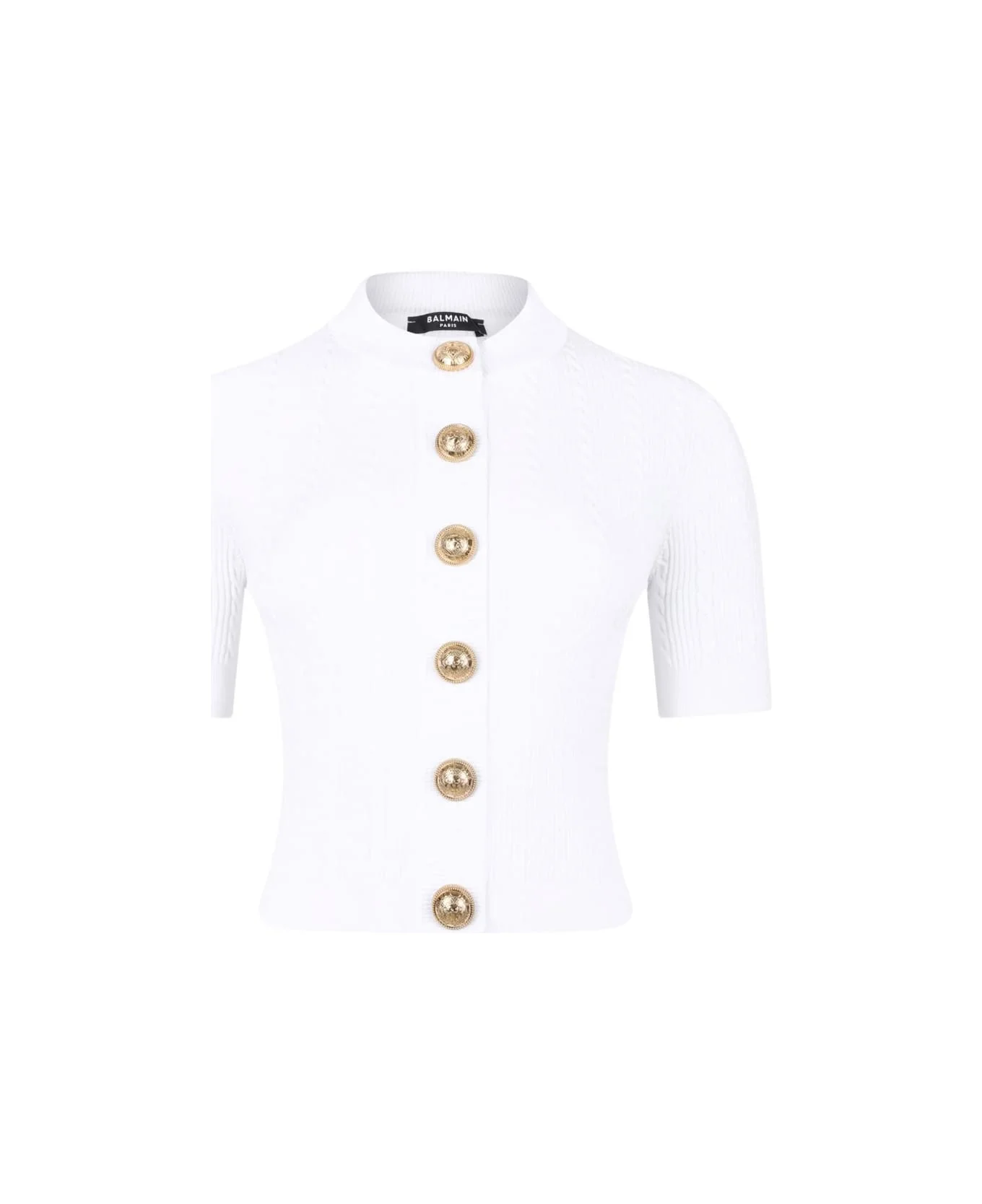 white ribbed knit short sleeves front button fastening Composition: 83% Viscose, 17% Polyester Made in: France Color: White Size and fit: - This piece fits true to size. We recommend you get your regular size - Model is 1,75m / 5ft 8in wearing size 36 (FR) Model number: FF1KL230KI500FA