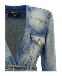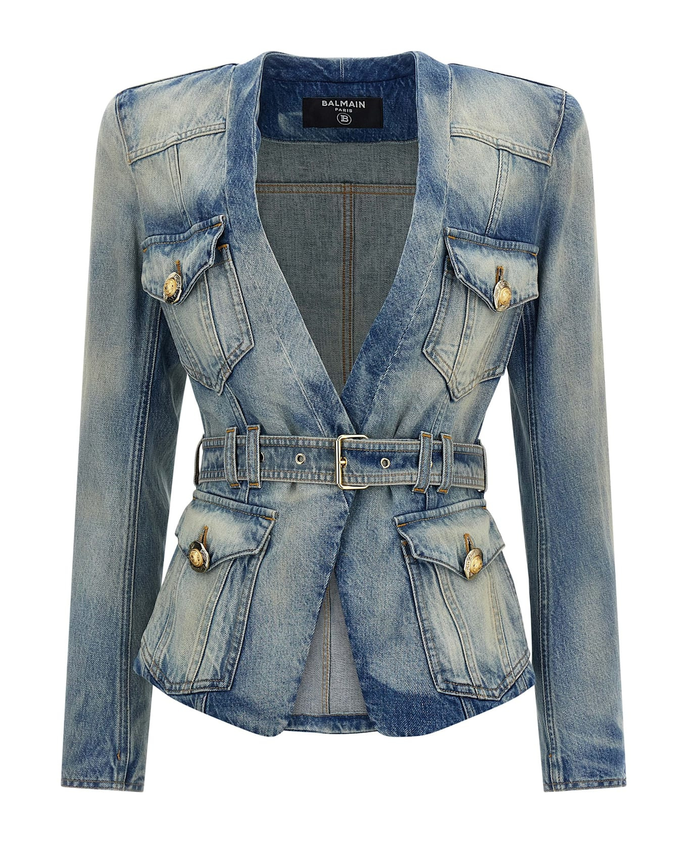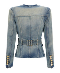 Stonewashed cotton denim single-breasted blazer with hourglass silhouette with front button closure, metal 'Gold and Silver Coin' buttons, V-neck, flap pockets, padded shoulders, long sleeves, and removable belt. Composition: 100% cotton Made in: Italy Color: Light Blue Size and fit: - true to size fit - FRENCH size Model number: FF1SI631DF796FC