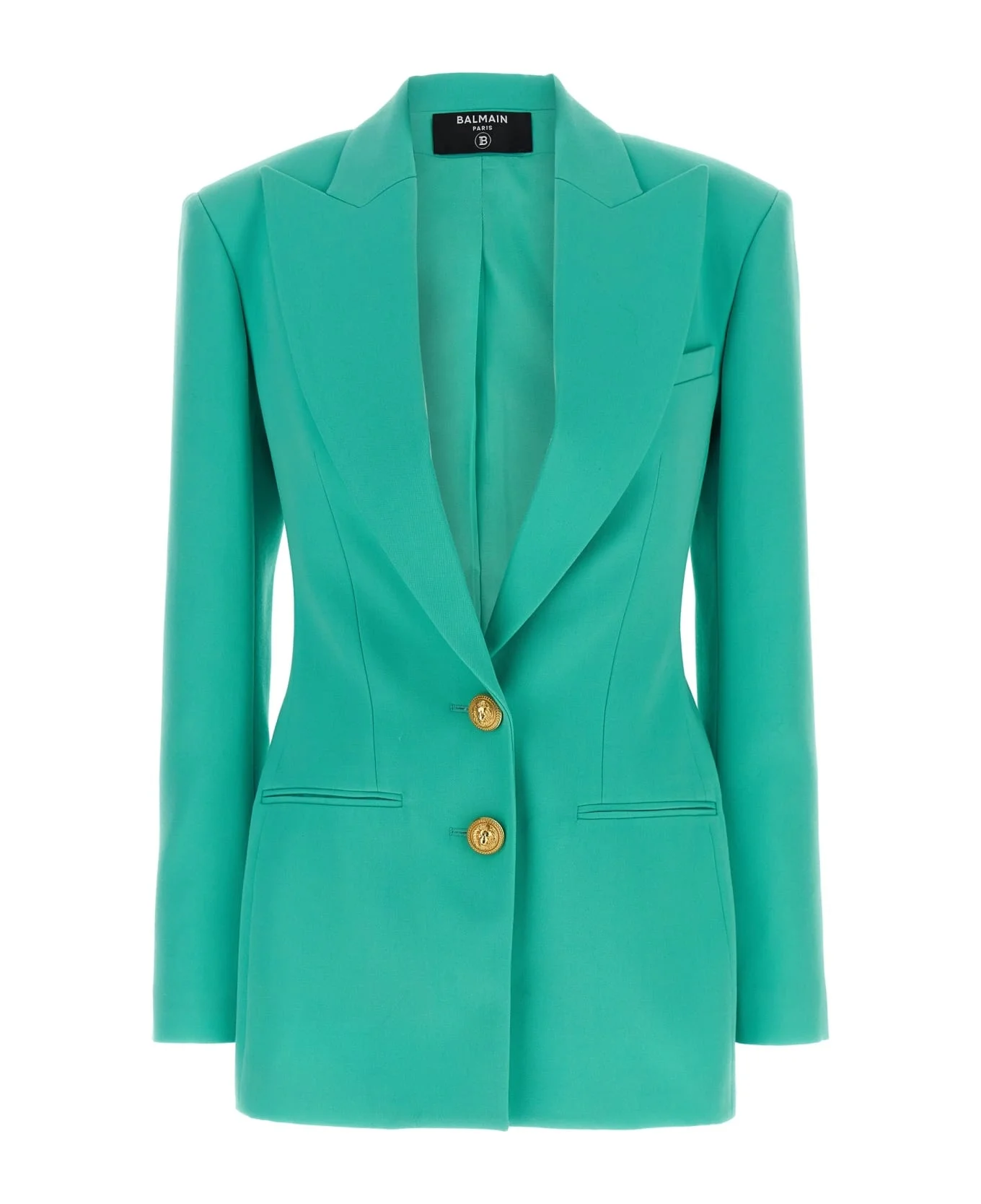 Double-breasted wool blazer with logo button closure, pockets, padded shoulders, long sleeves, back vent. Composition: 100% wool Made in: Slovakia Color: Light Blue Size and fit: - true to size fit French size Model number: DF1SE055WC097CN