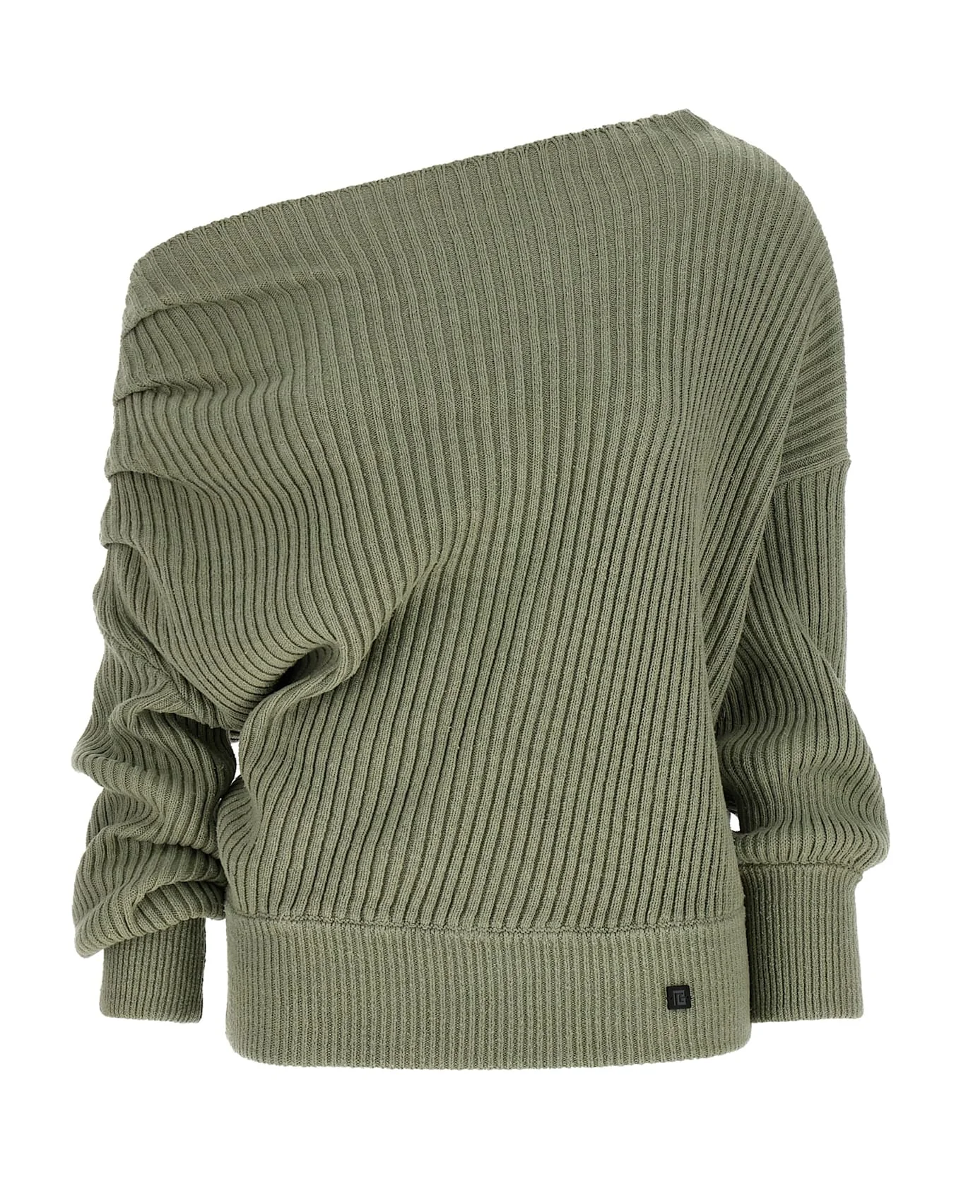Ribbed knit, asymmetric neckline. Folded with draping on the shoulder, front logo application, ribbed trim on the cuffs and on the bottom of the garment. Composition: 100% silk Made in: Italy Color: Green Size and fit: - Comfort fit Model number: GF0KK065KJ727EU